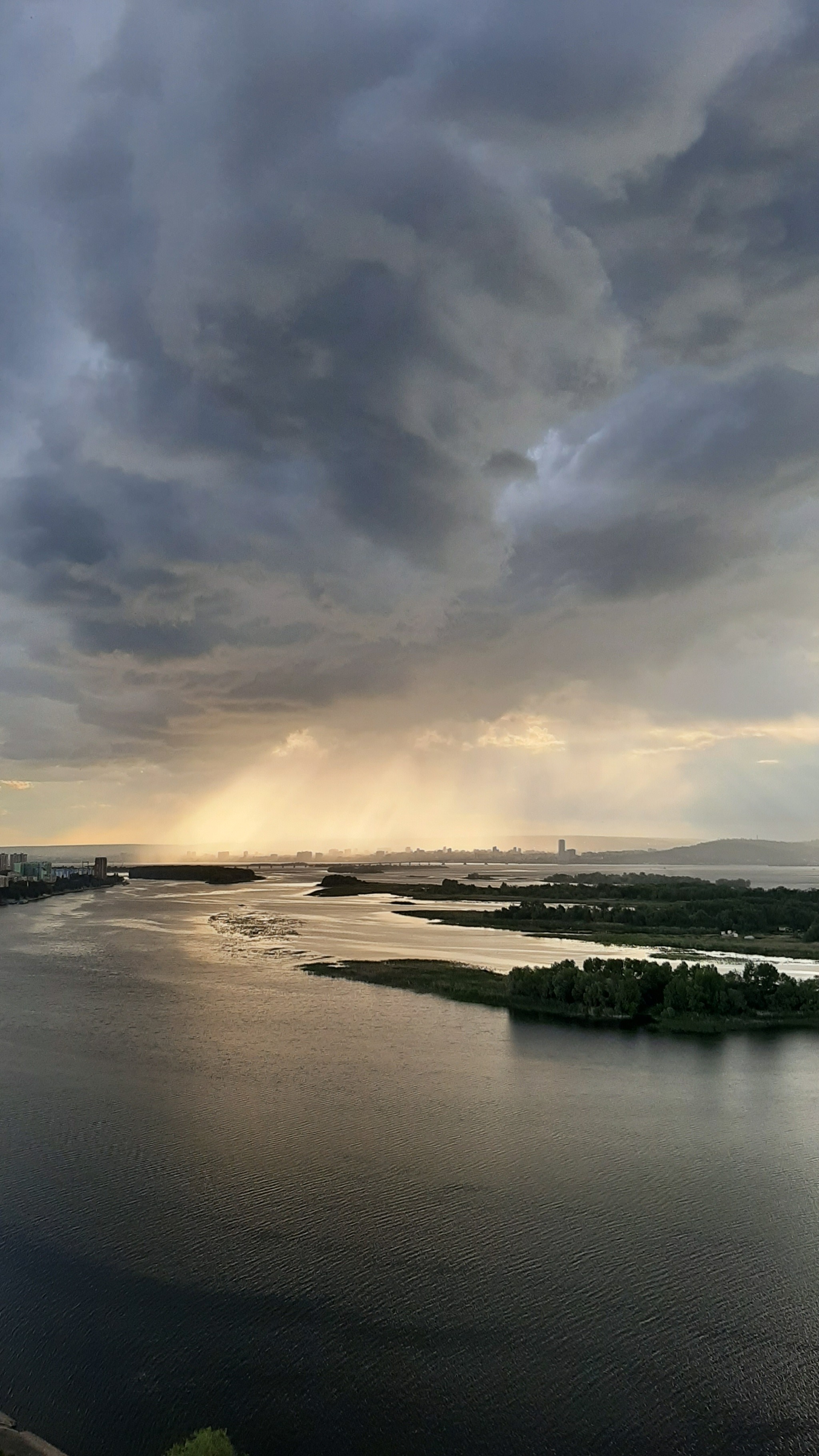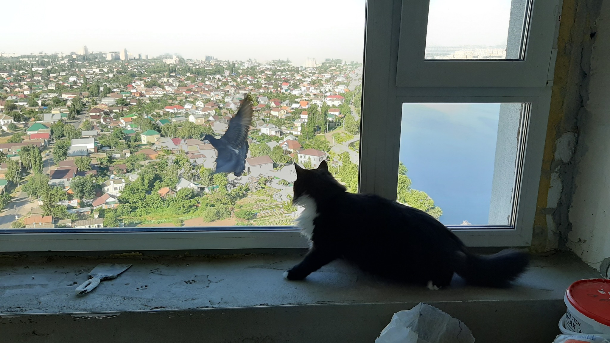 Вид, конечно, радует. Телевизора у нас нет, но он и не нужен. Канал Дискавери каждый день за окном. Движуха на Волге, грозы, радуга, стройка домов, пожары, фейерверки - все, что угодно показывают. Кот в шоке от близости птиц, до которых лапой подать.