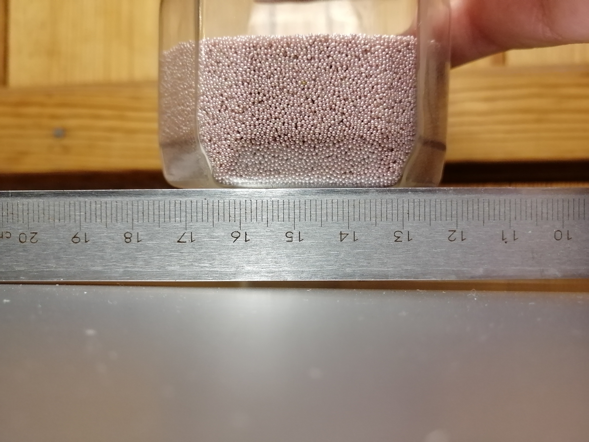 Дело за малым - найти средний объем одного шарика. Т.е. надо измерить средний диаметр этих "песчинок". Я не придумал ничего умнее, чем сфоткать их на фоне линейки, и по пикселям прикинуть средний размер