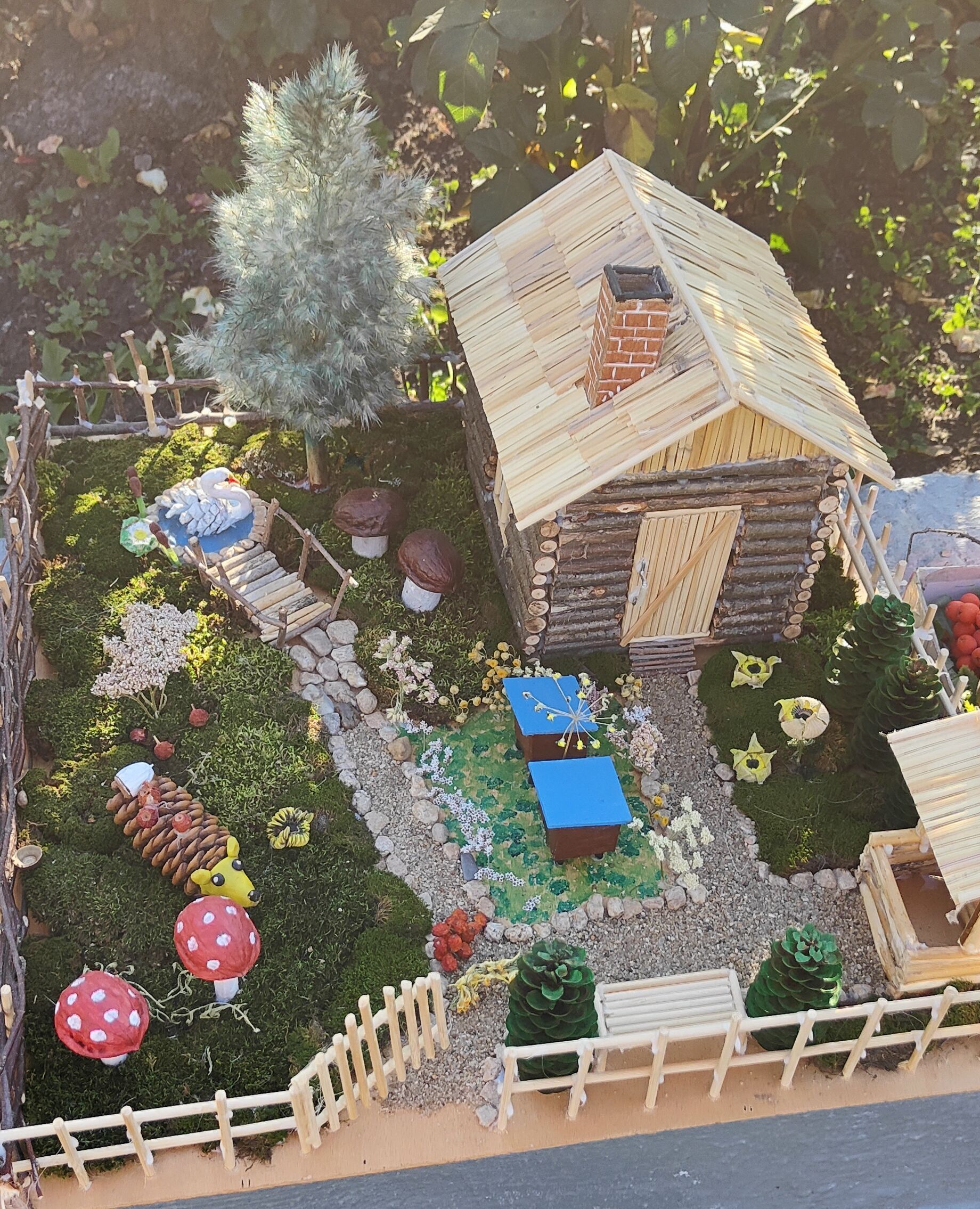 Следующий этап это озеленение острова. Я купила на WB несколько видов стабилизированного мха, цвет которых более или менее был натуральным. Сделала смотровую из зубочисток, из соломы хижины и выпила из палочек для суши маленькие лодочки