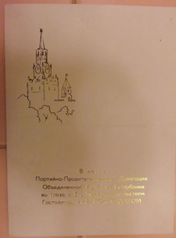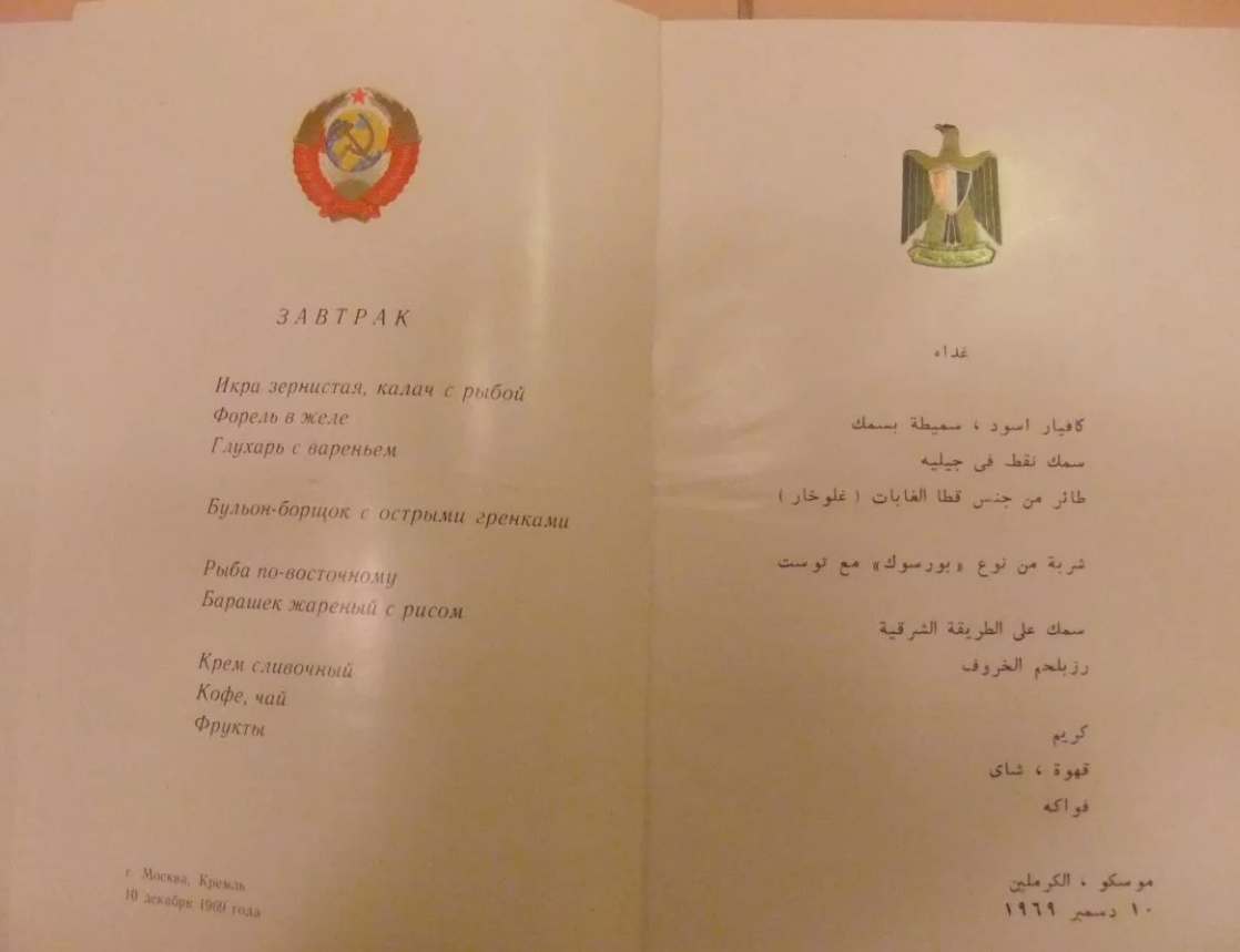 Меню завтрака в честь Партийно-Правительственной Делегации Объединённой Арабской Республики во главе с Его Превосходительства Господином Анваром Садатом .