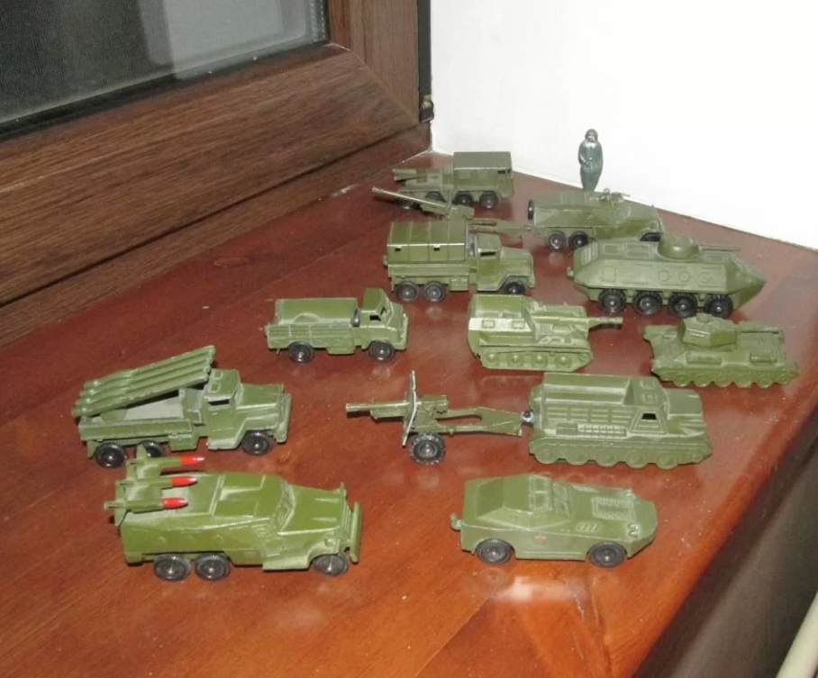 Набор моделей военной техники времен СССР. За всё 10 000. Ракетный тягач с отломаным прицепом ( на заднем плане) шел в подарок.