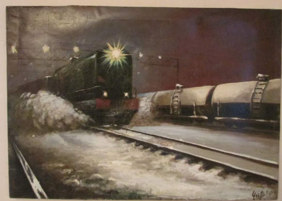 Картина, конечно не очень... Но , выставив её на Авито, я дал ей название " Железная дорога не спит ".