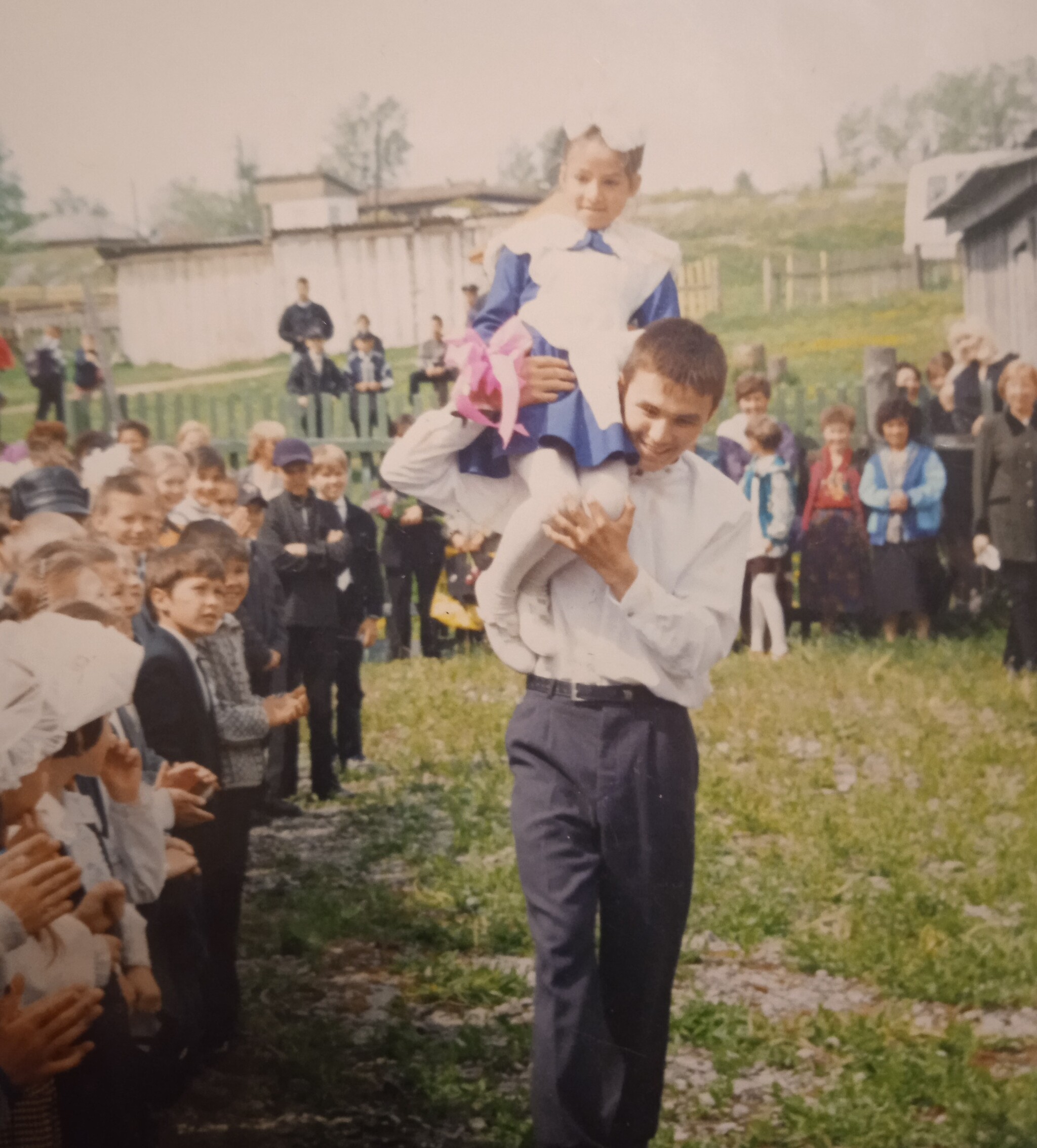 Мне 8 лет, сестрёнке 12. Меня несёт на плече высоченный одиннадцатиклассник, мне очень страшно, поэтому я вцепилась в его ухо и тихонько подаю выпускникам их последний звонок. Сестра улыбается и очень мною гордится, правда шутит, что я была похожа на мартышку.