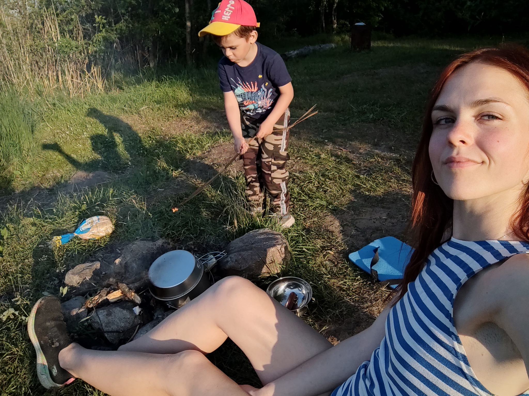 Ну и наконец. Приземлились на берегу. Зажгли костёр, суп поставили варить (вкуснее лесного супа ничего ещё не ела)).