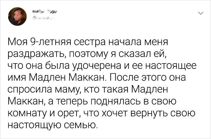 Я помню тот день, как вчера. 9:30 утра. Урок математики. Я просто ненавидел этот предмет, поэтому обрадовался, когда в класс зашёл директор, и попросил меня пройти с ним. Директор молчал, мне казалось, что он нервничал. Он завел меня к себе в кабинет, где уже сидела наша школьная медсестра. Когда я сел, директор, абсолютно не глядя мне в глаза, сказал, что случилось ужасное. В нашей квартире случился пожар и мои родители погибли. Младшая сестра в больнице. Директор предложил мне выбор: он может позвонить моим родственникам (из которых была только пьющая бабушка), вызвать социальные службы, или... Я могу пожить пока у него в семье. Я выбрал последнее. Помню, как мы ехали к директору домой на его машине. Я смотрел в окно, и все, о чем я мог думать: пожалуйста, пусть моя сестра останется живой. Я думал о том, что я мог остаться дома и спасти свою семью от пожара. Или о том, что лучше бы я сгорел там вместе с ними, а ещё лучше - вместо них. Мне было всего 12 лет. Когда мы приехали в дом директора, нас встретила милая женщина, его жена. Она уговорила меня съесть хотя бы один бутерброд (хоть и наготовила очень много блюд, которые я не хотел) и выпить апельсиновый сок. После этого я уснул. Когда проснулся, на столе возле моей кровати я нашел новую одежду своего размера (вся с бирками) и одежду для девочки. Директор с женой сразу же зашли мне и сказали, что с моей сестрой все будет хорошо. Ее пока что оставят в больнице, но потом мы будем вместе. Тем же вечером они повезли меня к ней. По пути туда мы заехали и купили сестре огромного плюшевого медведя. Ей было два годика, поэтому она ещё не понимала, что случилось. Дальше было много событий, но самое главное: нас с сестрой усыновила семья директора. Они стали нам хорошими родителями, нашей второй семьёй. Но параллельно с этим сделали все, чтобы мы помнили своих первых родителей и у нас остались хорошие воспоминания о них. Мы часто пересматривали фотографии, ездили на кладбище к родителям. Со временем боль ушла, осталась лишь благодарность за то хорошее, что раньше было. И мы зажили жизнью нормальных детей. Не знаю, сколько потребовалось усилий наших вторых мамы и папы, но они замечательные. И мы с сестрой благодарны им абсолютно за все, что они сделали и до сих пор делают для нас.