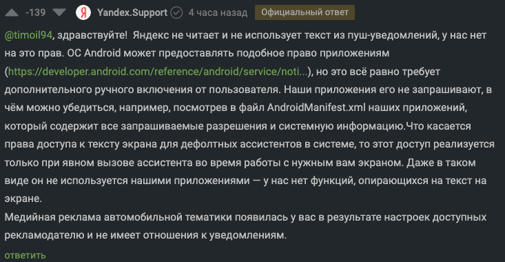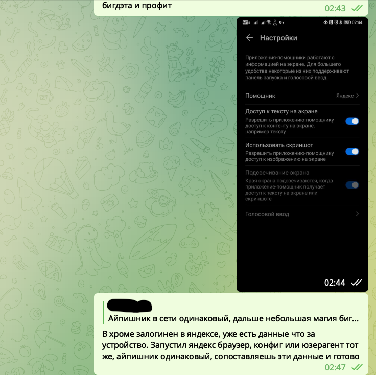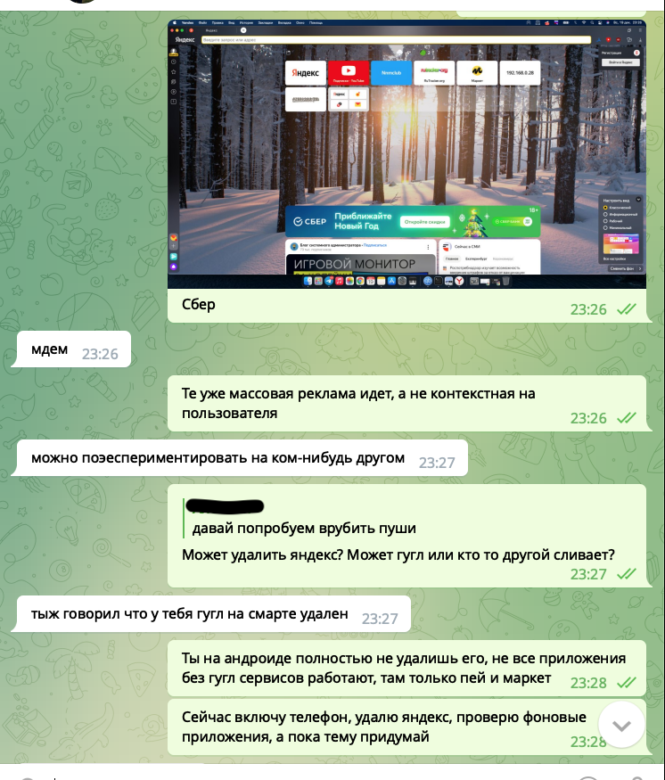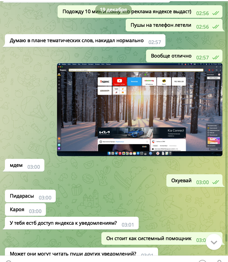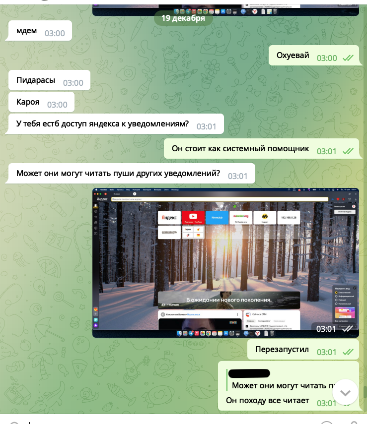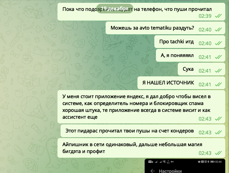 Вывод? Со 100% уверенностью яндекс читает пуш сообщения, анализирует ключевые фразы чтобы показать рекламу. Общаетесь в телеге в надежде что вас никто не "слушает", но вас "слушает" приложение яндекса, конфиденциальность, приватность? Не, не слышали. А что если яндекс хранит все текстовые пуш сообщения и в один момент могут оказаться не в тех руках? Например утечка, сбор компромата против вас.