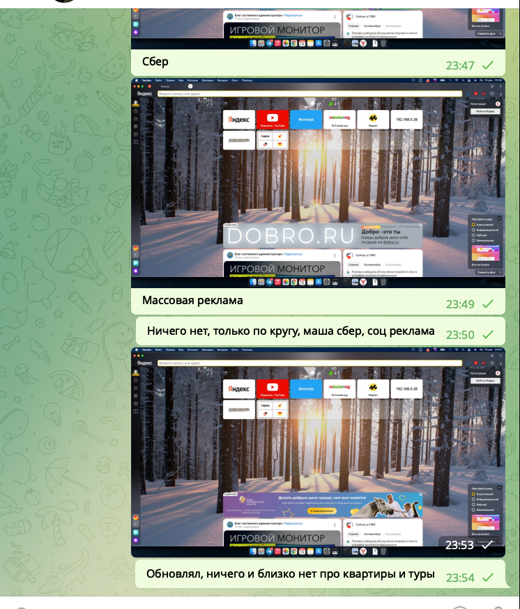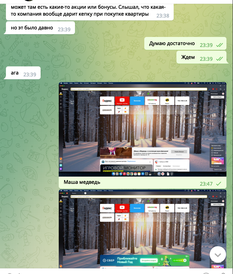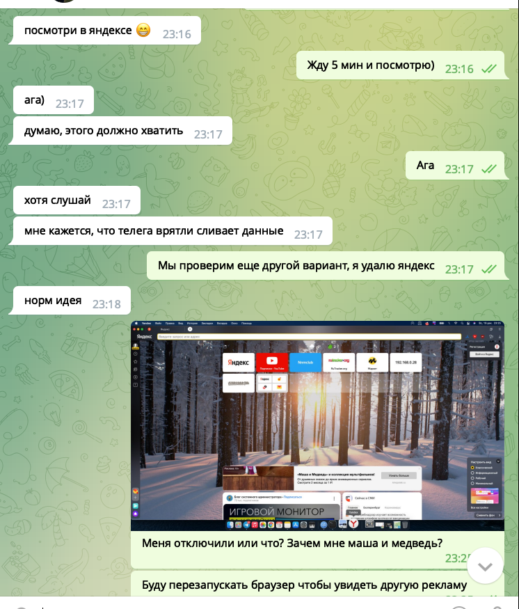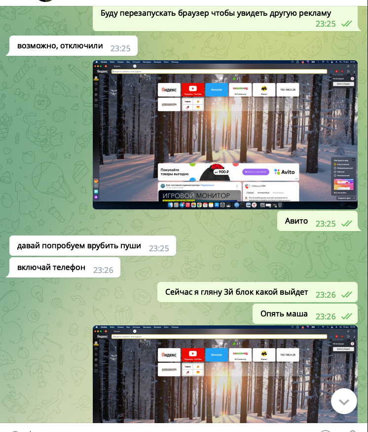 Как мы видим, переписка с выключенным телефоном, реклама в яндексе отображается массовая, реклама кинопоиска с машей и медведем, зеленого банка и сайт с объявлениями. Какой можем сделать вывод, телеграмм и apple не сливает переписку.