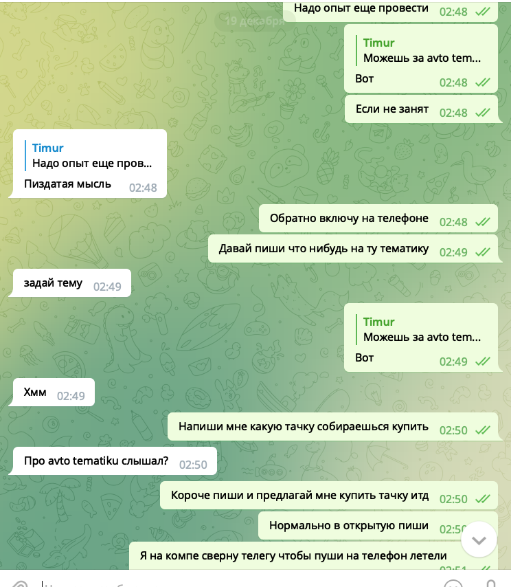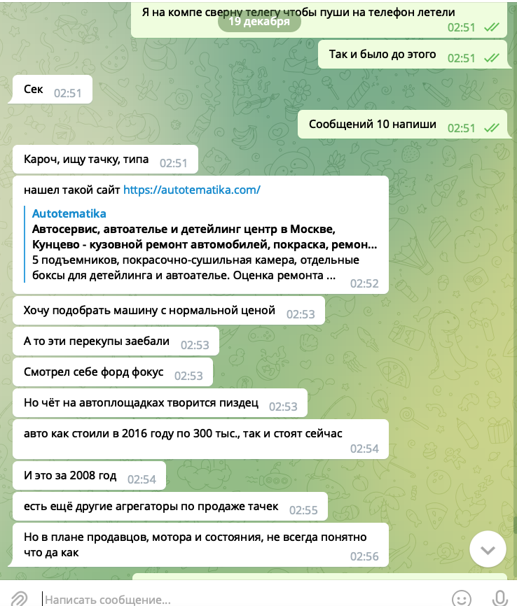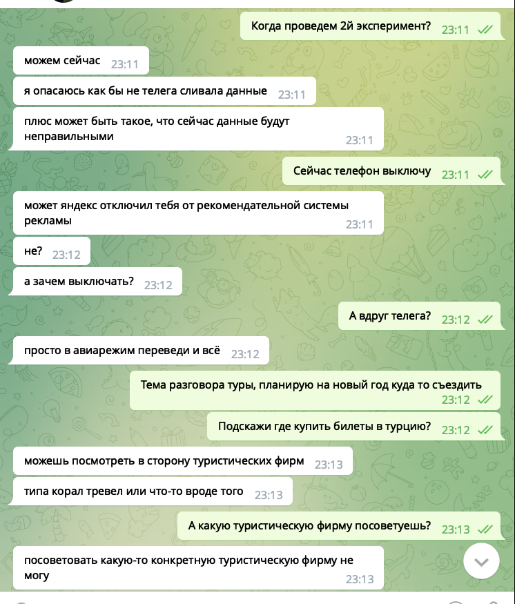 1. Выключаю полностью телефон, с другом раздуваем тему про туры, этот этап поможет выяснить что Павел Дуров жадный и решил как WhatsApp анализировать сообщения для точечной рекламы. А может у меня на компьютере вирусы или дело в Apple которая решила сливать нажатия с клавиатуры рекламным сетям?