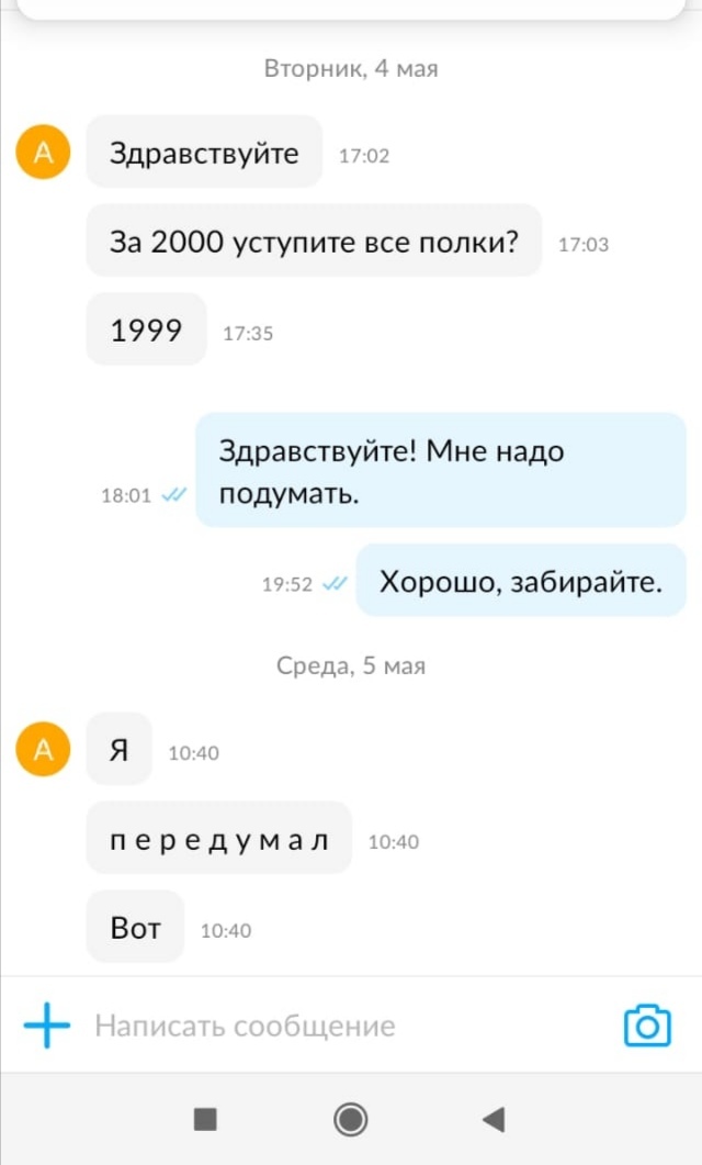 Подруга полки продаёт. За 3 тысячи. А тут вот такой потенциальный покупатель постучался.