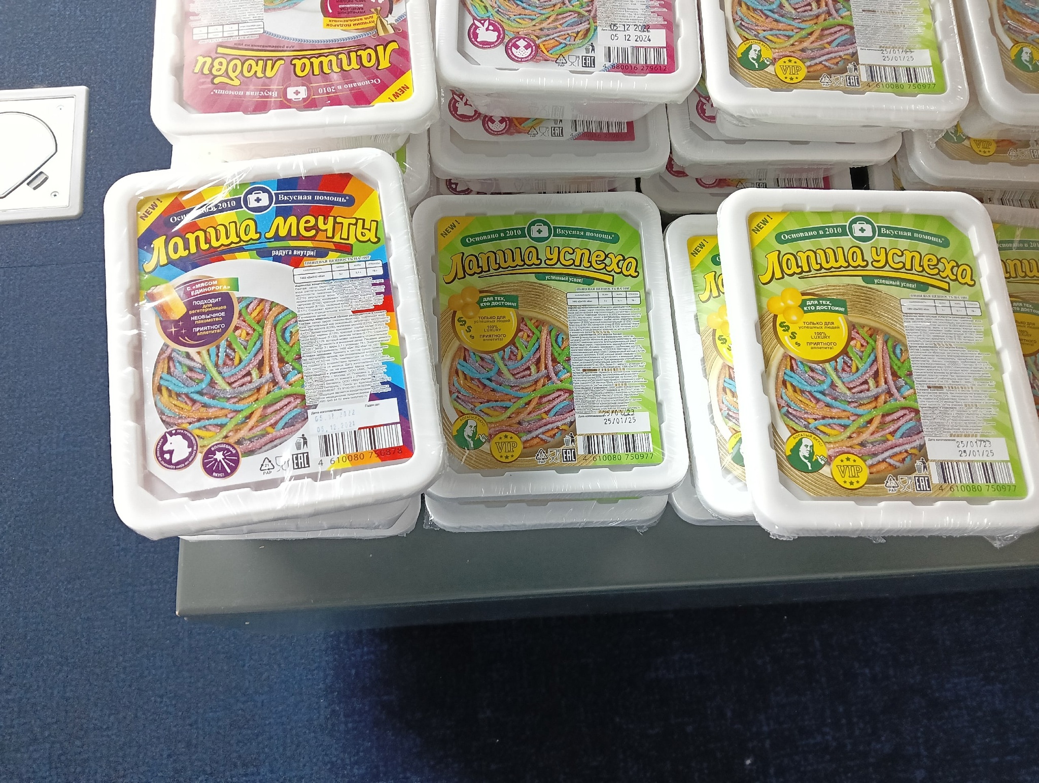 Под этим снимком можно было бы написать, что пассажиры и сотрудники на радости набирают полные тележки еды, но нет. Это привезли пополнить запасы на полках.