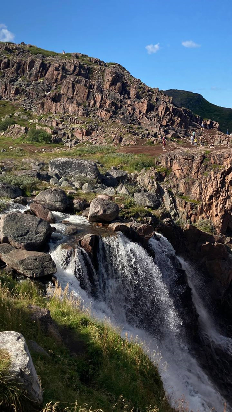 Водопад от озера тянется к заливу. Временами поток большой, временами мелкий. Нам повезло, увидели водопад во всей красе