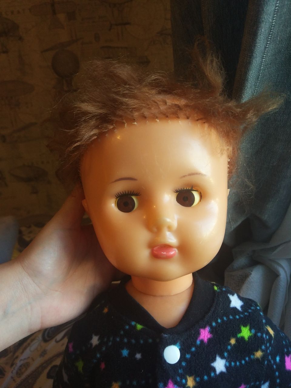 Однажды мой друг отдал мне старую куклу времён СССР, Фабрики 8 марта, которая лежала у них дома много лет, и пугала всех до усрачки, кто краем глаза её замечал. Состояние было приемлемым, нужен в основном косметический ремонт и новый наряд. Размером она около 65 см, довольно большая.