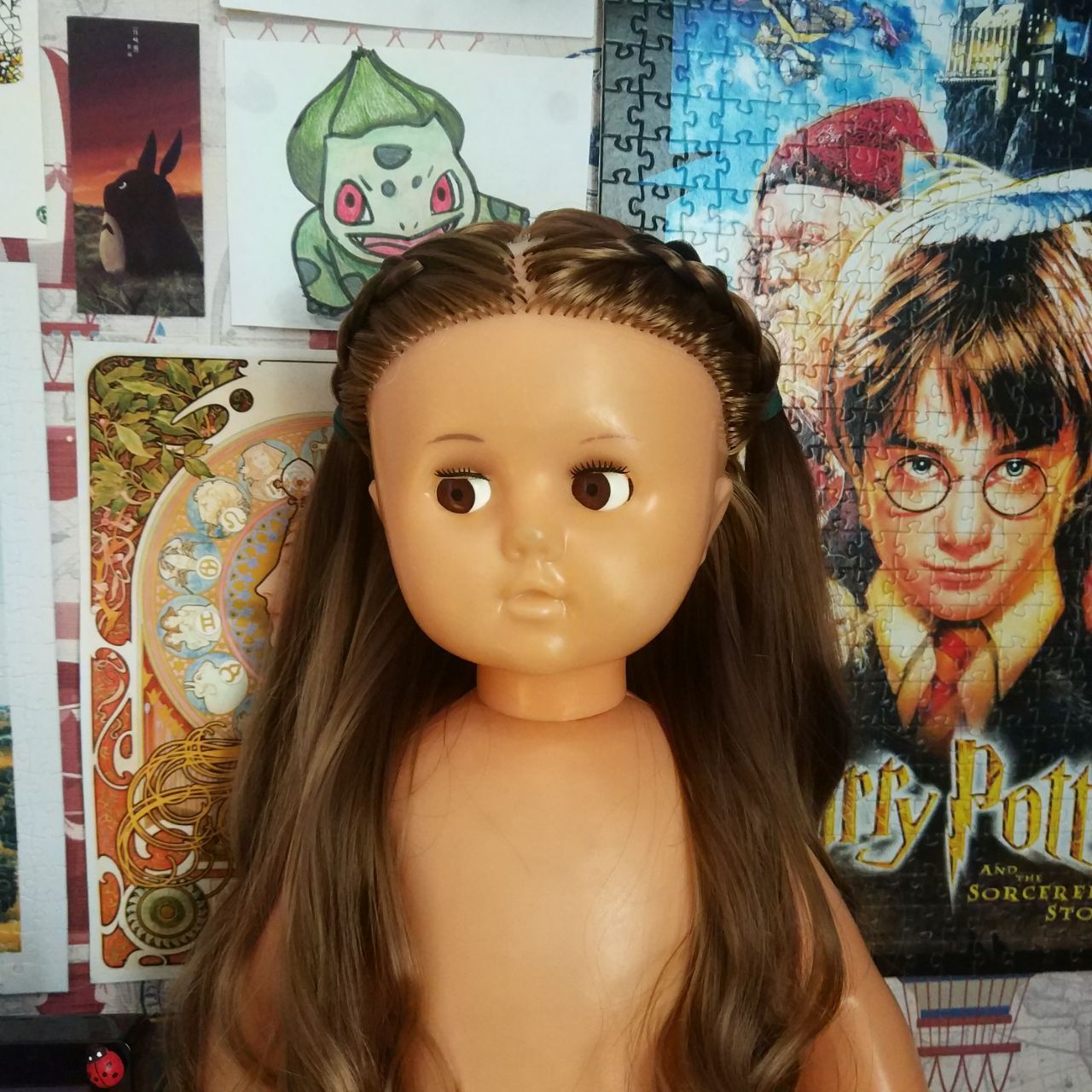 После избавления от старых волос прошила её синтетическими трессами двух оттенков, для более интересного цвета. Работала сапожным шилом с крючком, времени заняло порядочно. И было много боли. Пришлось ещё заводские занозы с пластика срезать, и раскалённой иглой пробивать дополнительный ряд волос, а то стык с пейтом был очень заметным.