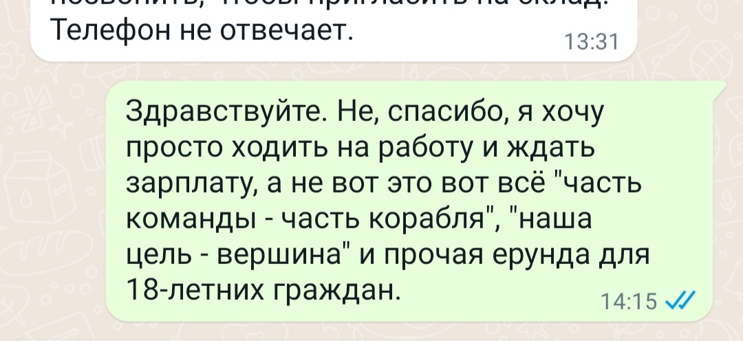 Но вот "не просто ходить на работу и ждать зарплату" меня зацепило как-то, потому что я считаю, что работа в первую очередь должна приносить деньги, а потом уже всякие моральные удовлетворени. И я захотел чуть потроллить, т.к. по описанию понял уже, что не мой коллектив. Отправляю такое сообщение