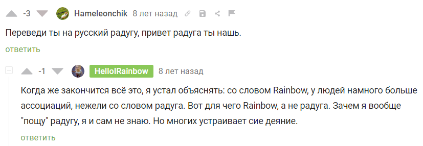 В основном ничего не менялось, день менялся днём, месяц месяцем и "Rainbow" неизменно появлялись у меня в ленте. В комментариях к его постам нет ничего интересного, большинство наезжает на заголовок, не всем нравится англоязычное рэинбоу.