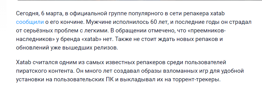 Ровно 4 года назад, 4 марта 2021 года, умер легендарный Xatab. Радик Низамутдинов с утра до ночи создавал репаки, чтобы видеоигры были доступны даже детям из бедных семей.