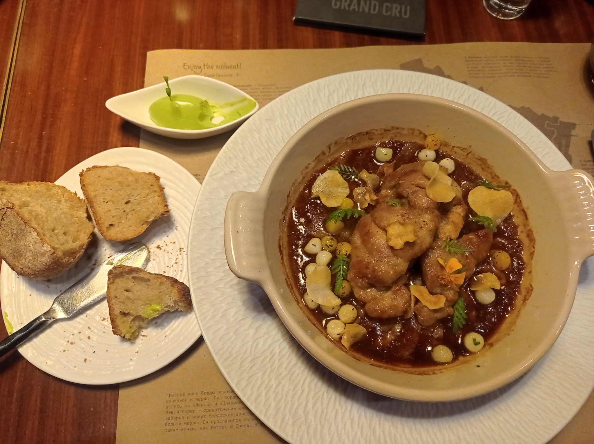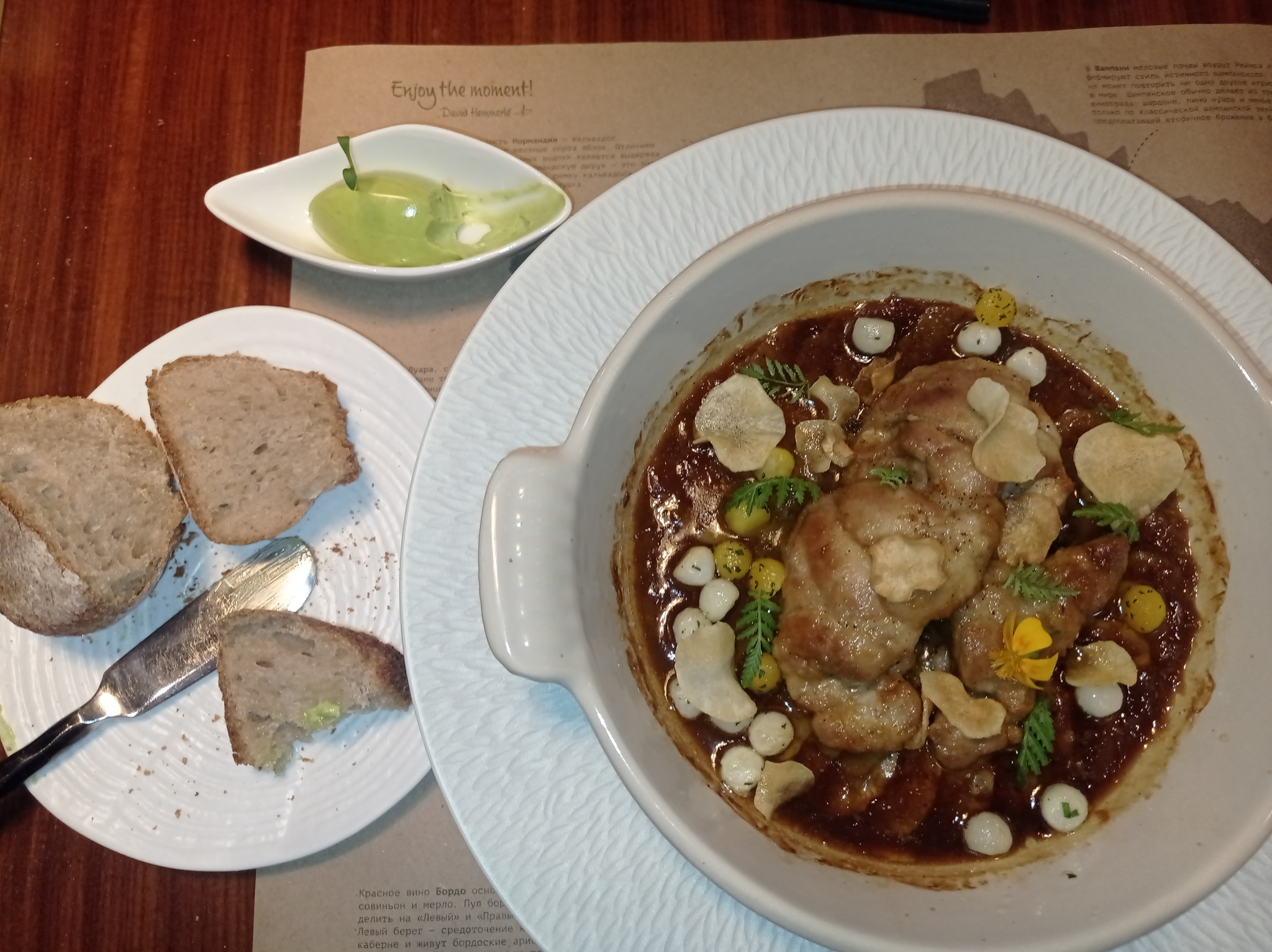 Официант учтиво и дофига вежливо начал рассказывать про "Ра-де-во". Опять же вроде русскими словами но на каком-то непонятном мне языке. Из того, что я понял это какая-то железа молодого телëнка с сельдереем и жемчугом из какого-то корнеплода с неизвестным мне названием и морской капустой. Подаётся в соусе из эстрагона.