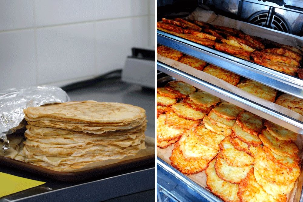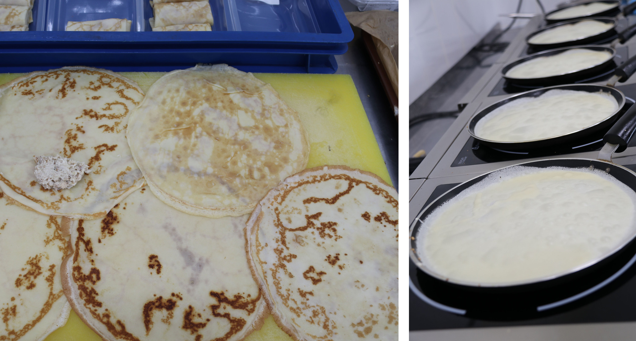 Пока одна партия блинов заворачивается, следующая уже на сковородах