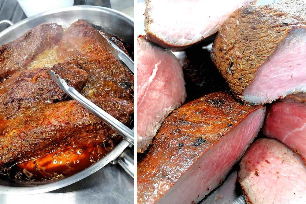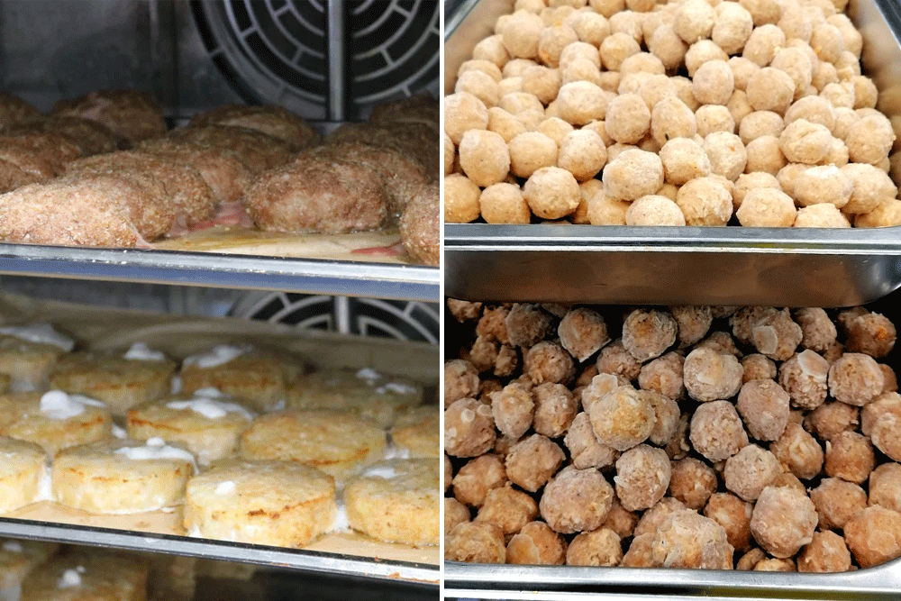 Во-вторых, само производство диктует условия. От шницелей остается много свиной обрези. Это классная свиная корейка, просто мелкими неровными кусками. Так не пожаришь, зато фарш выходит офигенный. Но котлет из него получится слишком много. И не заморозить - нужно место для других продуктов. Поэтому из фарша делаем и котлеты, и начинку для блинов, и фрикадельки в суп, и кладем его в греческую мусаку. И это только один пример, их таких десятки.