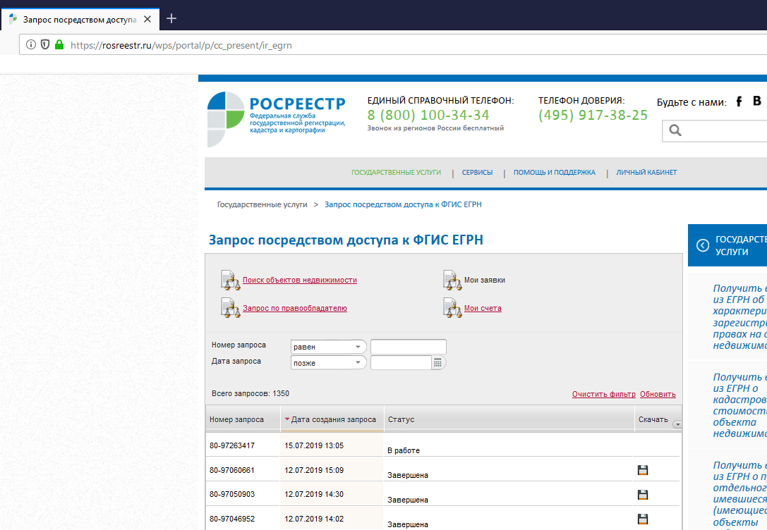 Получение выписок осуществляется в разделе «Мои заявки». Готовность выписки определяется статусом завершена и «дискетой» в графе «сказать». Для скачивания нужно нажать на дискету.