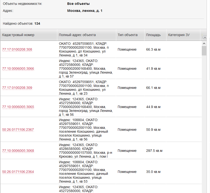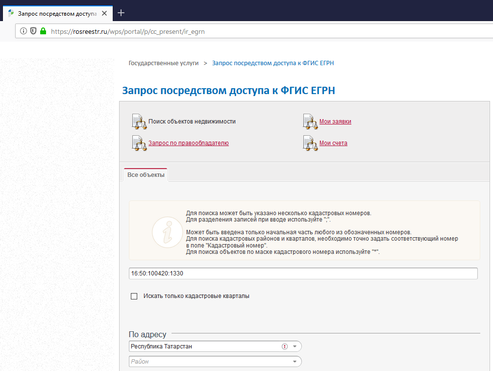 Заполняем обязательную графу "субъект РФ" и дальше указываем либо кадастровый номер, либо адрес (город, улица, дом, квартира) и видим что-то подобное.