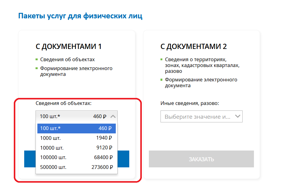 Перед заказом выписок нужно оплатить Росреестру пакет предоплаченных выписок. Самый дешевый пакет из 100 выписок стоит 460 руб. После оплаты заказ выписок доступен на следующий день.