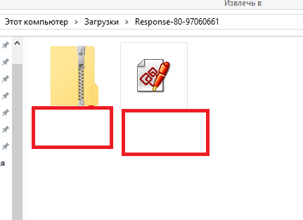Скачанная выписка представляет собой архив с названием «Response-80-97060661.zip», где 80-97060661 – номер заявки. Внутри архива находится два файла – архив с выпиской и электронная подпись Росреестра.