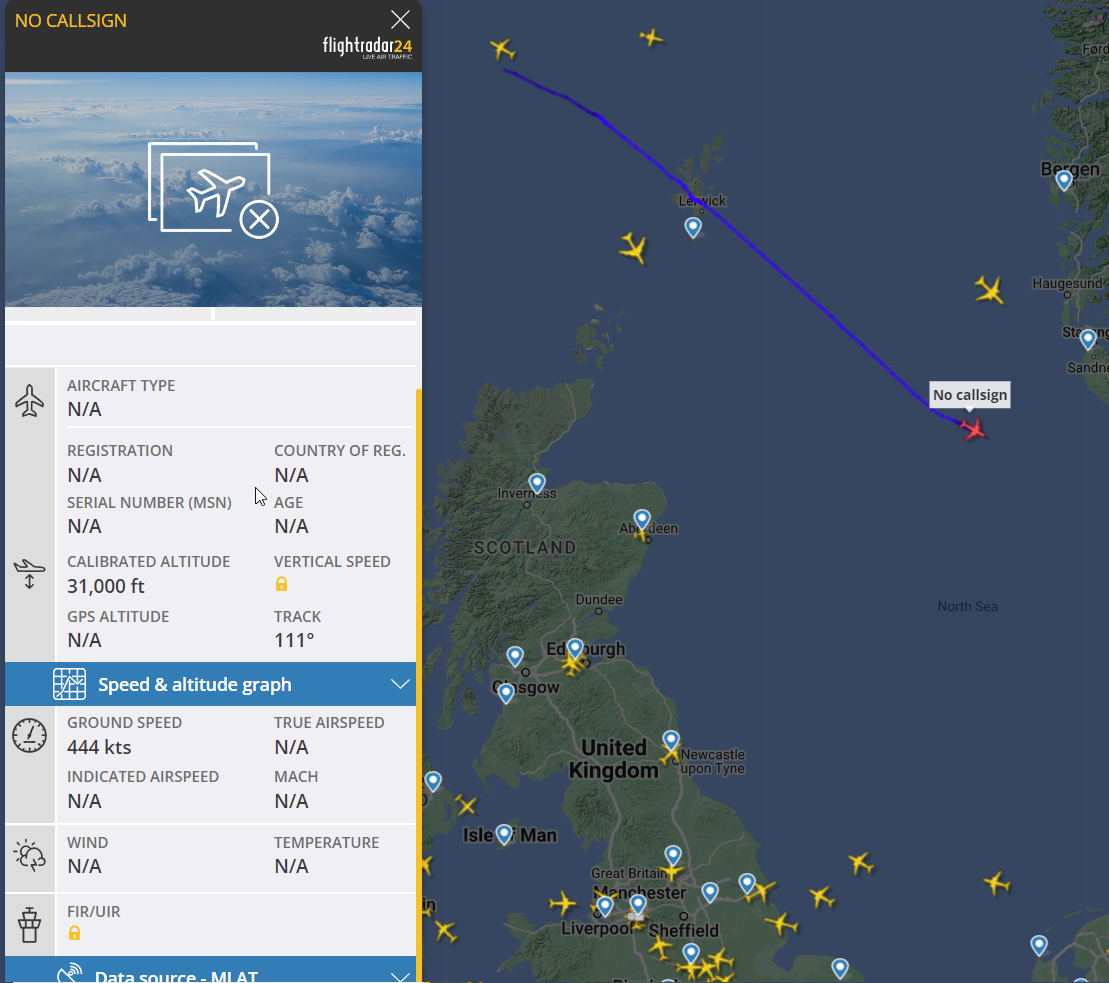 Потом появляется интересный борт без позывных, который прилетает откуда-то со стороны Север айлс.
