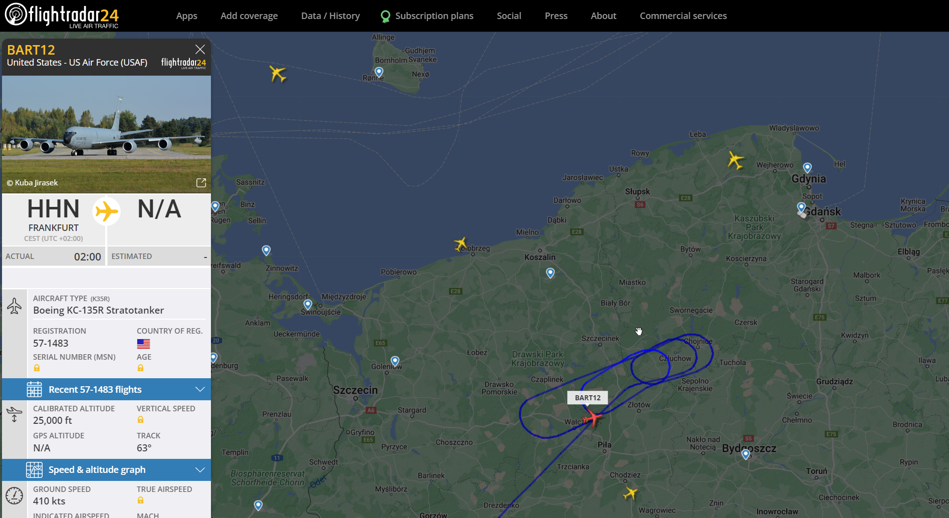 01:30 Он долетает до Польши, и похоже заправляется в воздухе от Американского заправщика
