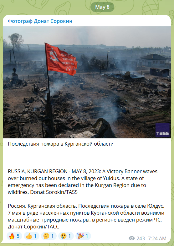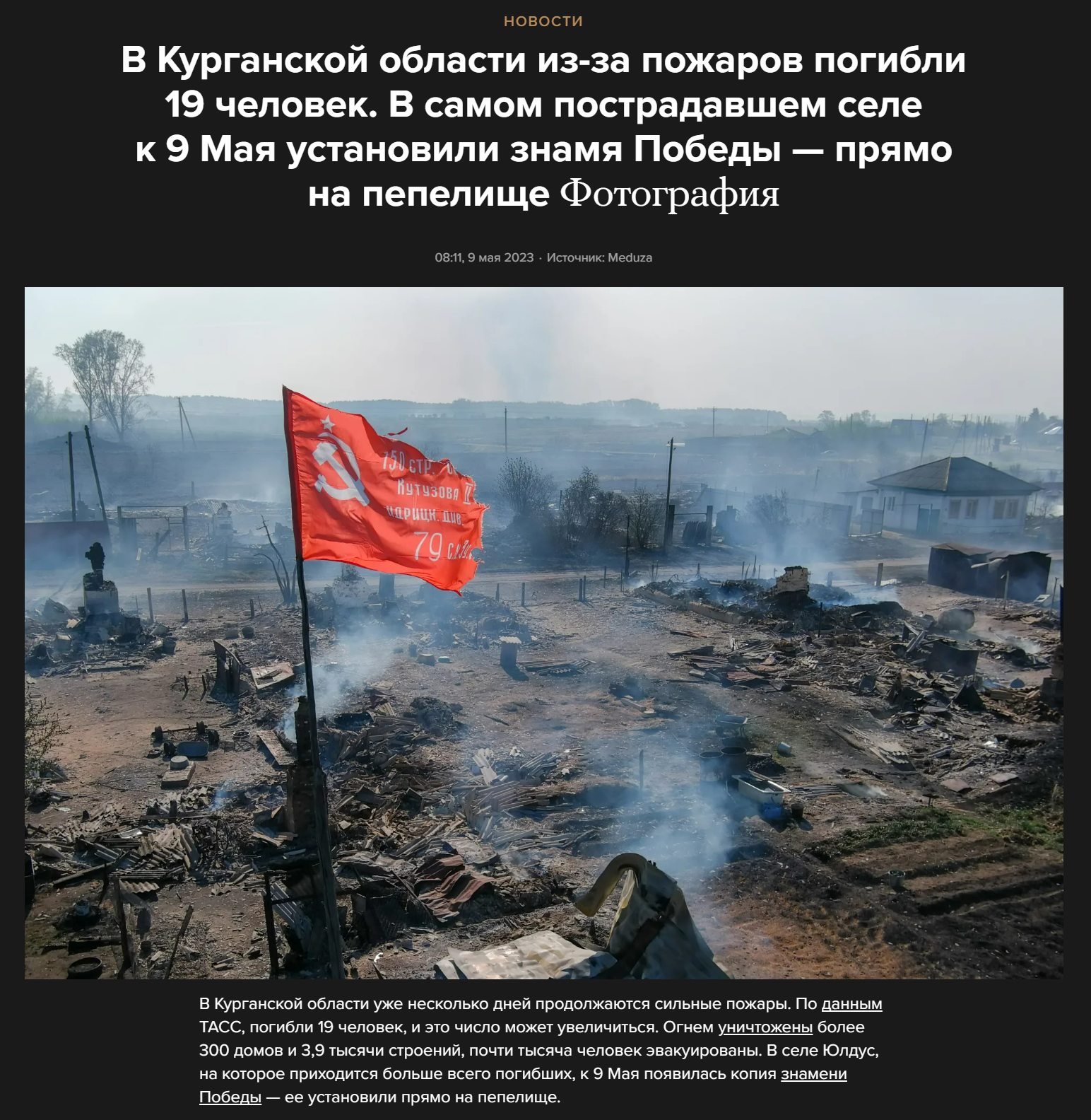 Согласитесь, что сам текст звучит абсурдно. Сразу встает вопрос - кто мог установить это знамя сразу после чудовищного пожара? Владелец сгоревшего хозяйства? Сотрудники МЧС, которые занимаются тушением? Односельчане погорельца? Мне не составило труда погуглить и понять, что никто никакое знамя на пепелище не водружал. Всё гораздо проще - оно там было до пожара. Предлагаю погрузиться в это минирасследование.