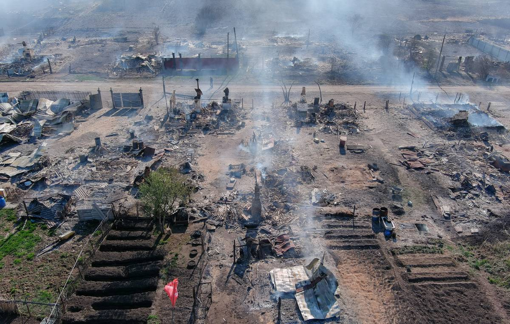 В селе Юлдус, на которое приходится больше всего погибших, к 9 Мая появилась копия знамени Победы — ее установили прямо на пепелище.