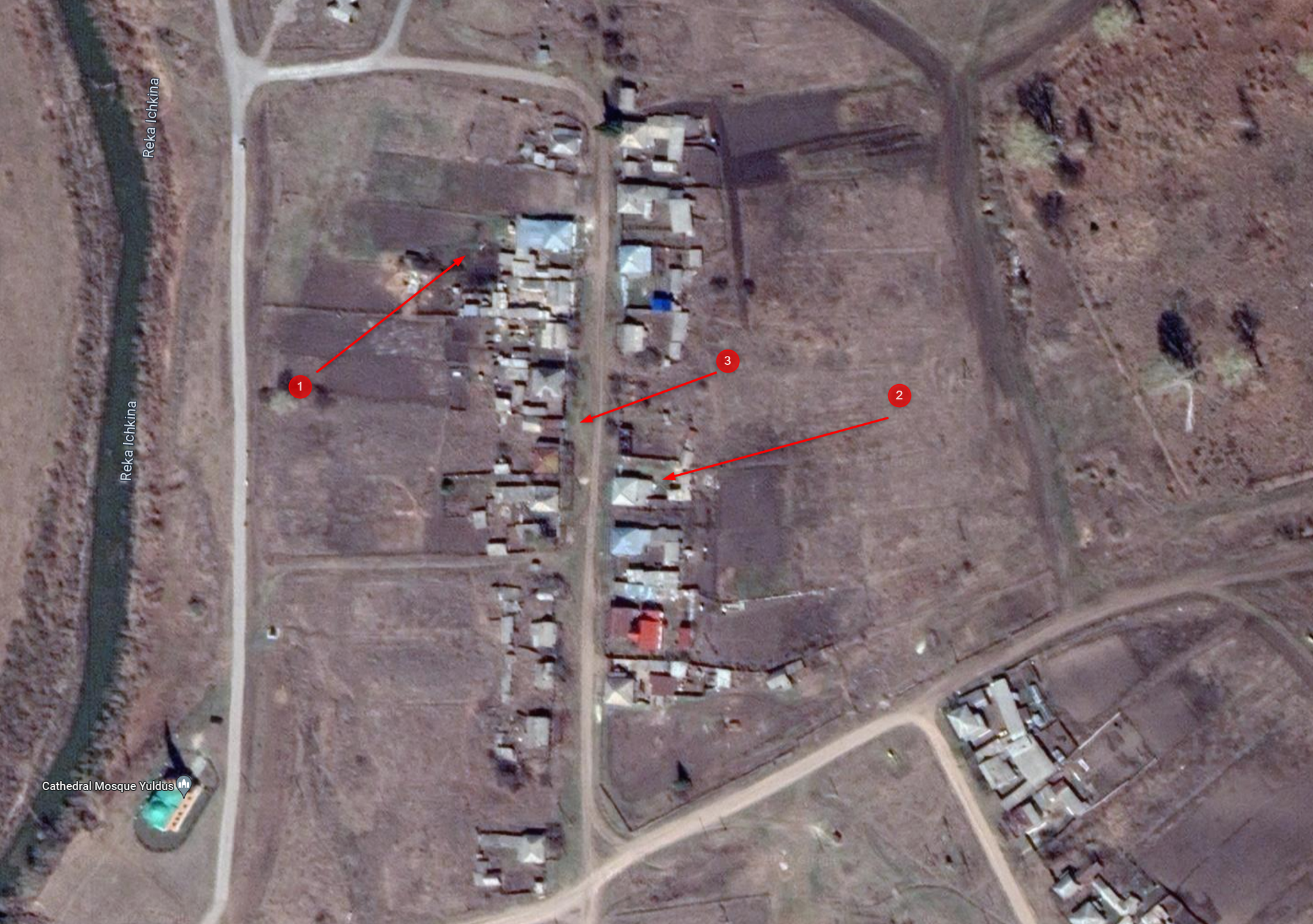 Имея отличную привязку к местности, давайте взглянем на карту. В первую очередь сразу видно, что это отшиб села и флаг установлен на частном участке (просто воткнут в землю за домом):