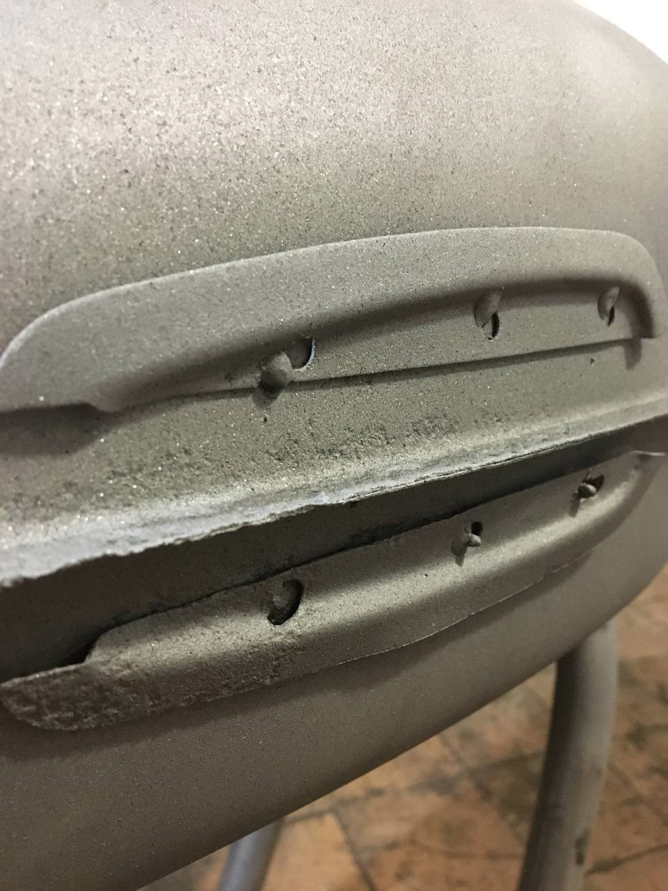 Пескоструйка деталей. Что-то очищал вручную кораловым кругом, что-то шлифовальным, а где-то, как, например, тут без песка не обошлось бы. Часть бензобака под резинкой.