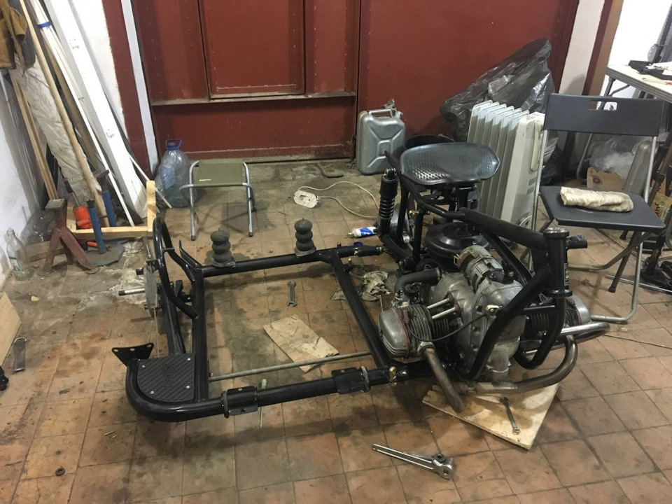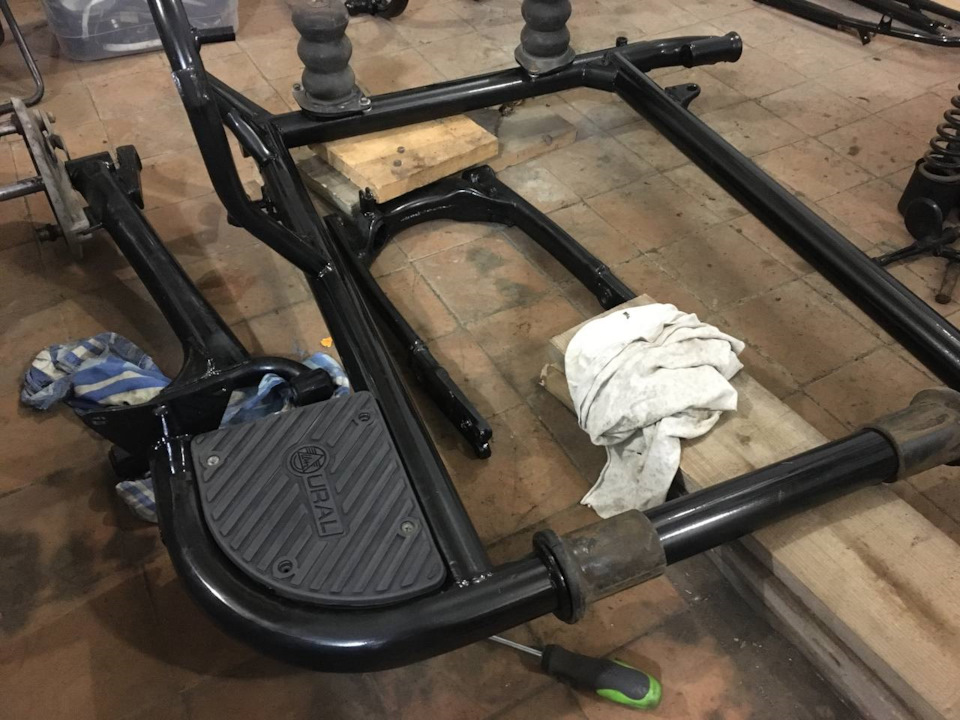 Рама покрашена. К раме бокового прицепа приварена современная подножка, такая, которая стоит на современных Уралах. Теперь садиться в коляску гораздо удобнее.