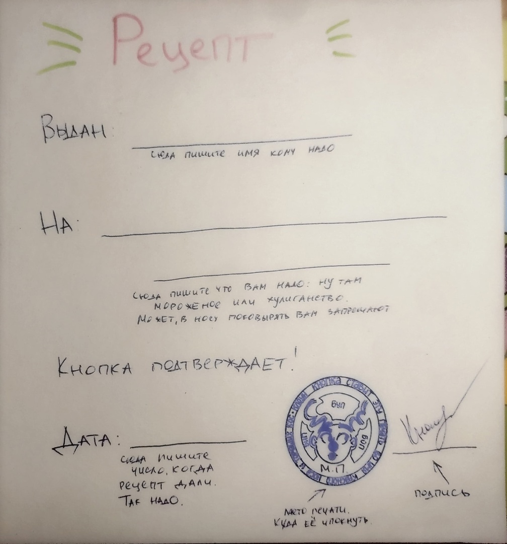 - Могу и рецепты выписывать. Например, на 100 кг мороженого. Или на 3 обязательных хулиганства в день.