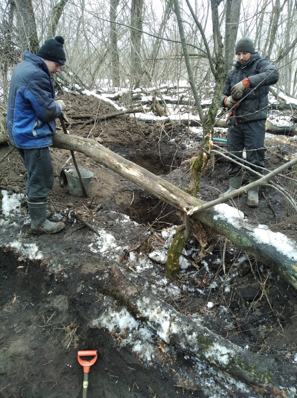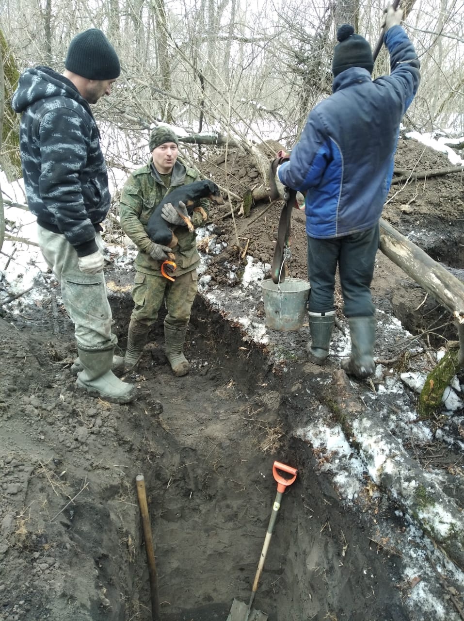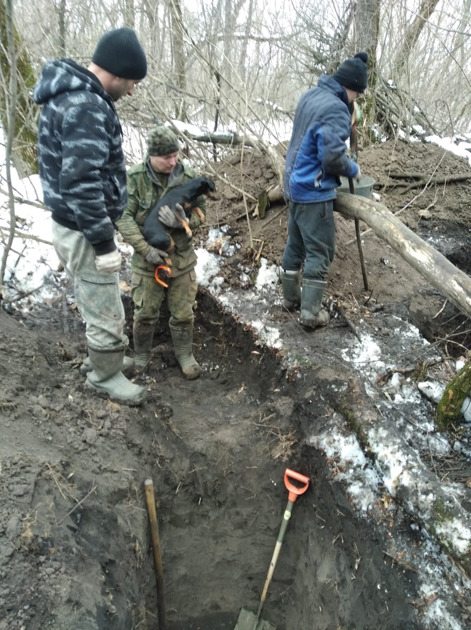 – Мы копали примерно по три ямы в день дотемна. Земля проморожена на 20 – 30 см. Но сложность ещё и в том, что там вокруг много деревьев и нужно было копать аккуратно, чтобы не повредить их корни. Залезали в норы, кричали и свистели, но ничего не было слышно. Я в те дни практически не спал. А 8 февраля я попросил друга из Коренево пустить в нору его таксу. Думал, что она сможет обозначить, где моя Нора. Запустили. Но такса унюхала барсука, а не мою собаку, и увела нас по ложному следу. Зря прокопали не в том направлении. Она нас немного сбила. Но в тот момент, когда мы отдыхали, совсем в другом направлении мы услышали глухие звуки. Как удары под землёй, – объясняет Александр.