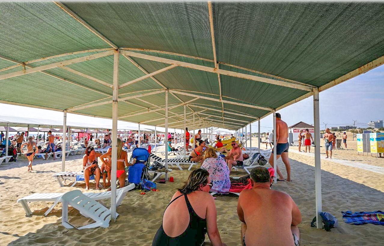 Семья отдыхающих постелила вон то синенькое полотенце в тени от навеса, но подошел хозяин конструкции и стал предлагать отдыхающим заплатить за то, что они расположились в тени его навеса или уходить на солнце.