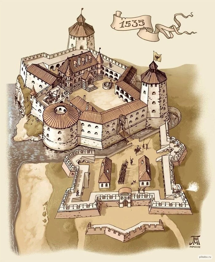 Крепость 16 века, по старой привычке называемая замком - ненужный донжон, только зря подставлявшийся под обстрел, разобрали и укрепили его камнем приземистые стены с казематами для крепостной артиллерии, такие же толстые башни по углам продолжают вести фланкирующий обстрел, но чувствуют, что их время уже истекло.