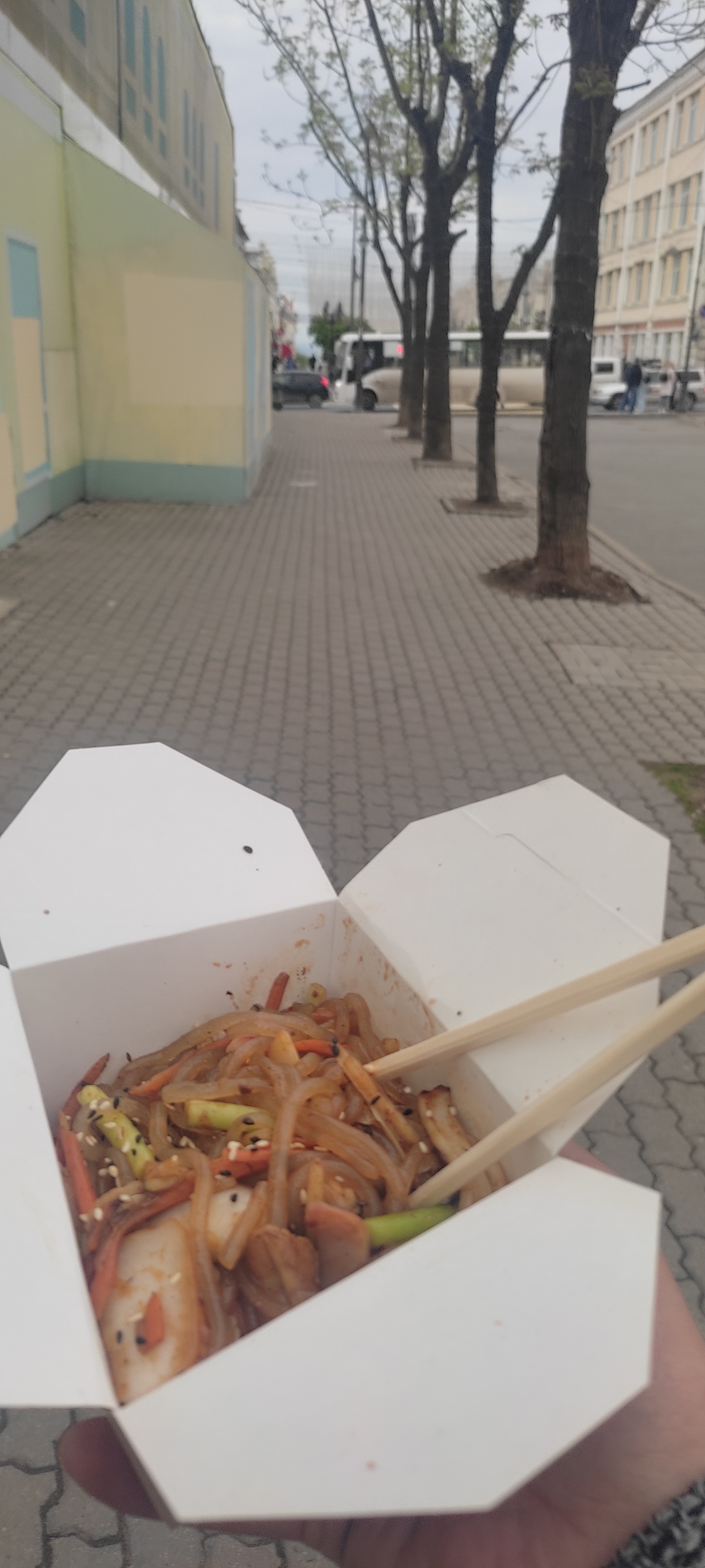 Весь день натощак, проголодался, но сидеть не хотелось. Взял удон с морепродуктами и продолжил пешеходить. 300 рублей, грамм 400, наверное, порция. Остро. Вкусно.