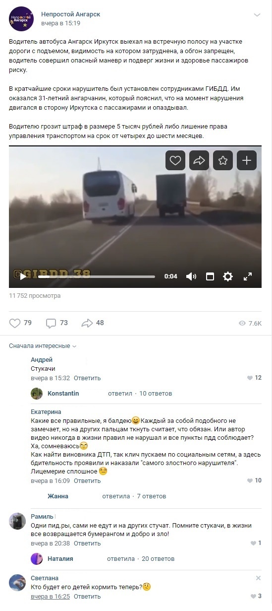 Вчера еду после работы. Краем уха слушаю радио маяк. Время 18 20. Тема передачи Стукачи. Так, кто снимают нарушения, и отправляют в ГИБДД. И вот они смеются, обсуждают, что же движет этими людьми, как они докатились до этого и тп. Т.е речь не о том, что не нарушайте, нет. Именно о том, какие стукачи нехорошие.