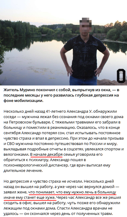 В психиатрии есть термин "быть в критике", это когда пациент осознаёт своё состояние и понимает что он болен, что его состояние - это проявления болезни, которую надо лечить. Очень часто люди в депрессии не понимают этого, полностью погружаясь в свой черный мир и им в этом случае трудно помочь. Этот же случай меня особенно задел, т.к. тут человек был в критике, но ему не хватило сил. Это очень важно, т.к. близкие могли его в это время спасти, если бы понимали что это был крик отчаяния. Мы не знаем что ему ответила жена, но возможно отмахнулась или сказала дежурные банальные фразы. Не надо так делать. Почему я выделил декабрь - лечение в таких случаях не помогает быстро. Чтобы почувствовать какой-либо эффект от схемы, назначенной психиатром - надо принимать препараты как хотя бы 2 недели и не факт что они помогут - замена схемы это стандартная процедура. Ему надо было сразу ложится в стационар.