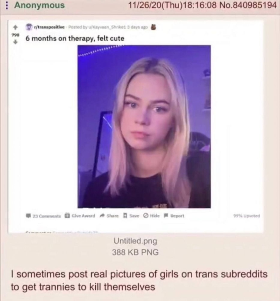 Перевод: Иногда публикую фото настоящих женщин под видом трансов на тематических сабреддитах что бы трансы вешались от зависти.