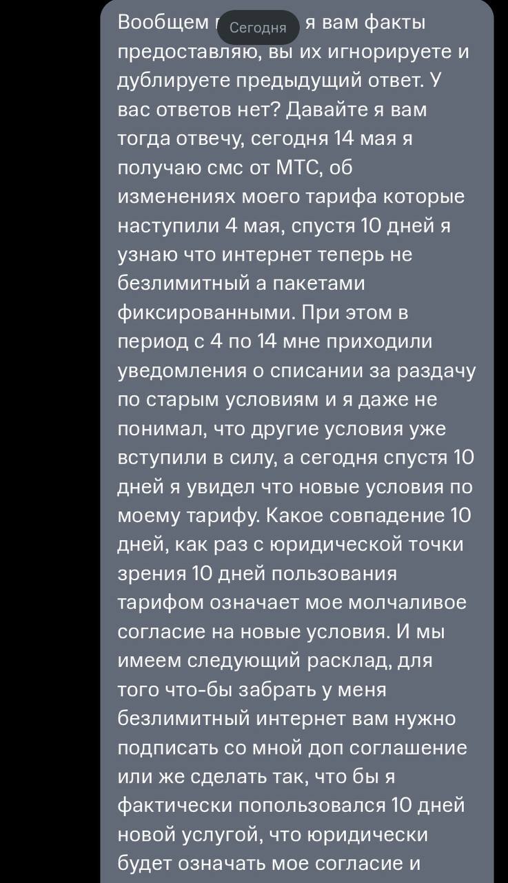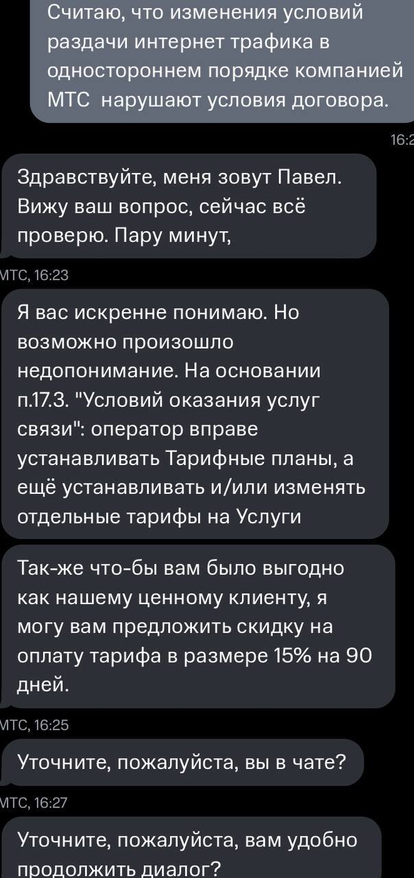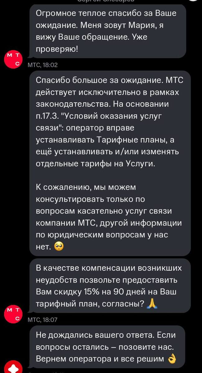 Тут смс от МТС прилетел, что теперь буду платить больше за тариф. Тариф тот же, да только надо войти в положение МТС - они ж и вышки ставят, и звонки сохраняют ну и все такое. Решил обращаться в поддержку и выяснять - с какого хера в одностороннем порядке они себе позволяют. А чата больше нет в приложении. До оператора и раньше было не дозвониться - теперь и опции такой нет. И если на прошлой неделе автоответчик говорил, что операторы работают с 8 до 22 - то сейчас на 0890 вообще варианта "оператор" не озвучивают.