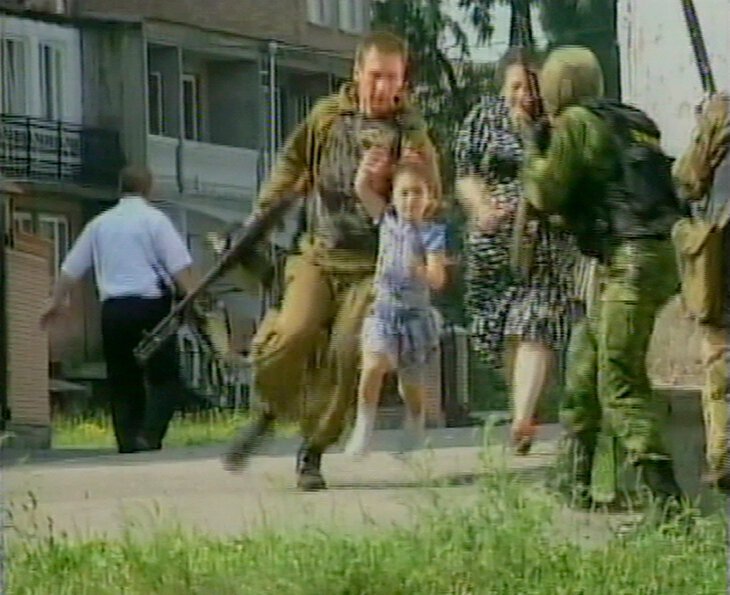 В школе учились дети офицеров же, так что оружие террористам выдали быстро – автоматы и пистолеты. По воспоминаниям одного из бойцов, в казарму буквально ворвался их комбат и отобрал пистолет у лейтенанта, чтобы отдать бандитам. В итоге больше полусотни заложников – детей и военных – запихали в грузовик, и двинулись на аэродром.