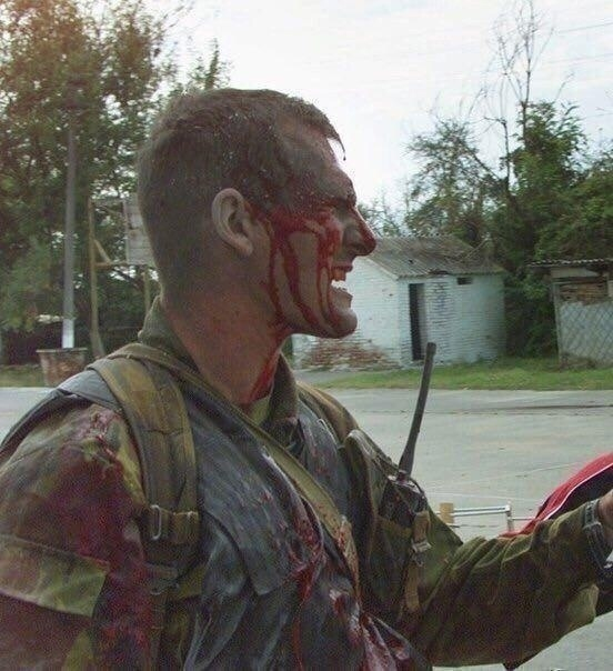 Этого раненого офицера западные журналисты позже прозовут "Русский танк", он несколько раз с ранениями вернётся за детьми в школу. Беслан, 2004 год