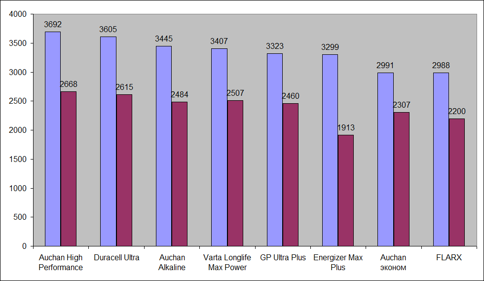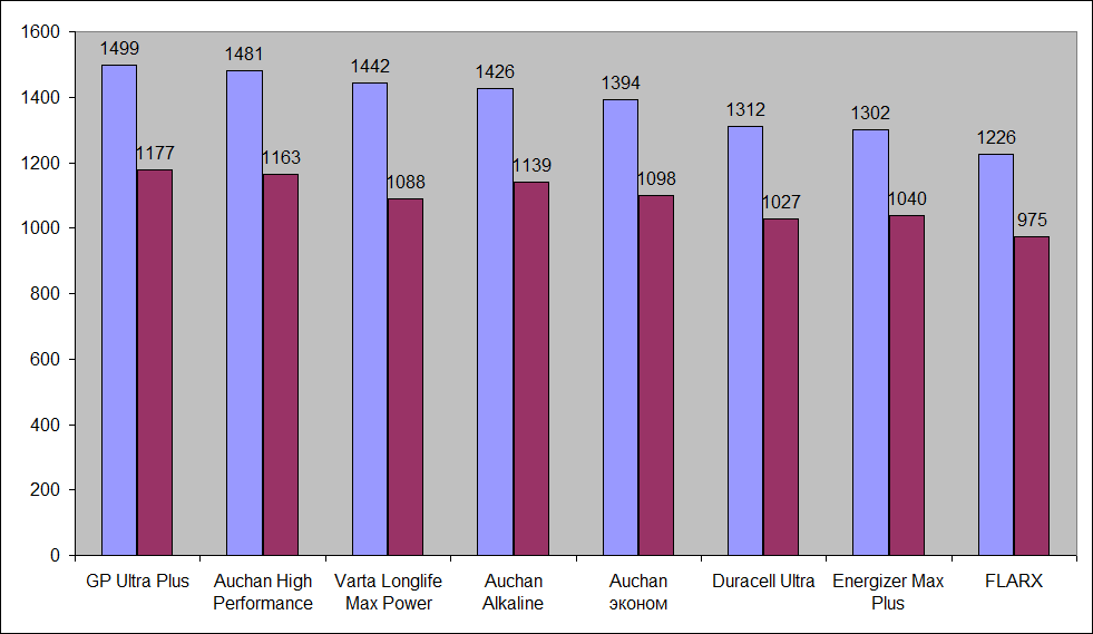 Тестировалось по два экземпляра каждого типа батареек. На диаграммах указано среднее значение ёмкости в мВтч.