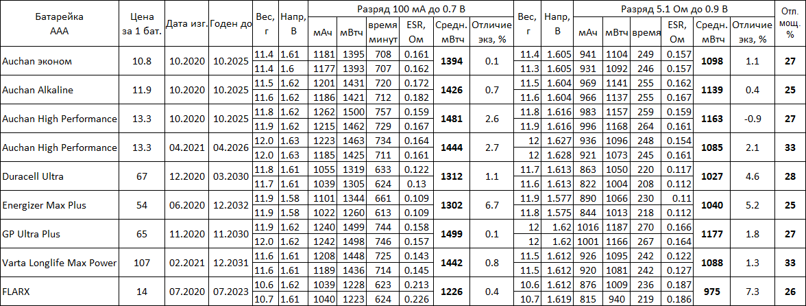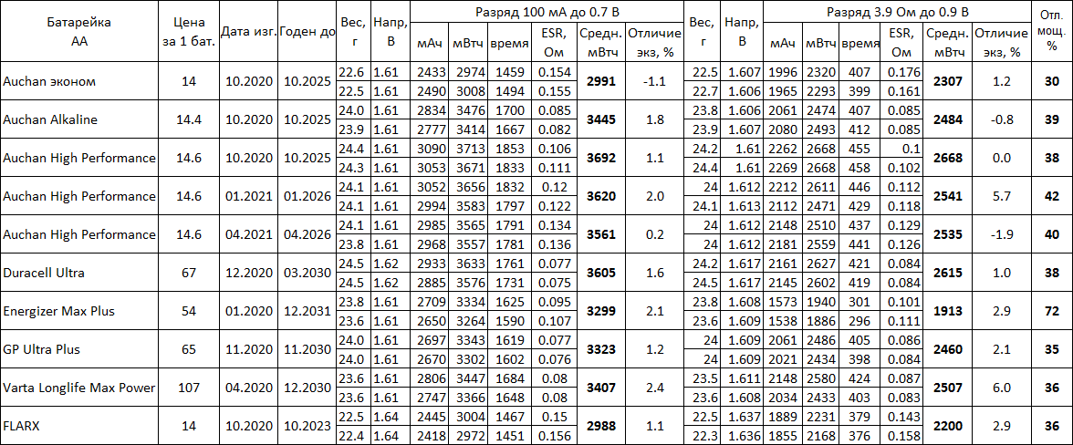 Приведу все результаты измерений для обоих экземпляров каждой модели батарейки.