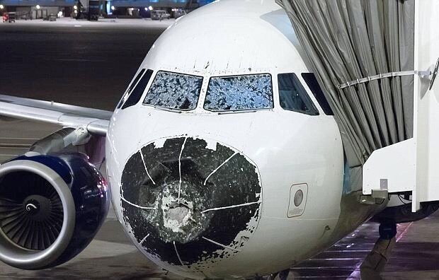 Град повреждает обшивку, лобовые стекла кабины, двигатели. Были случаи остановки всех двигателей.