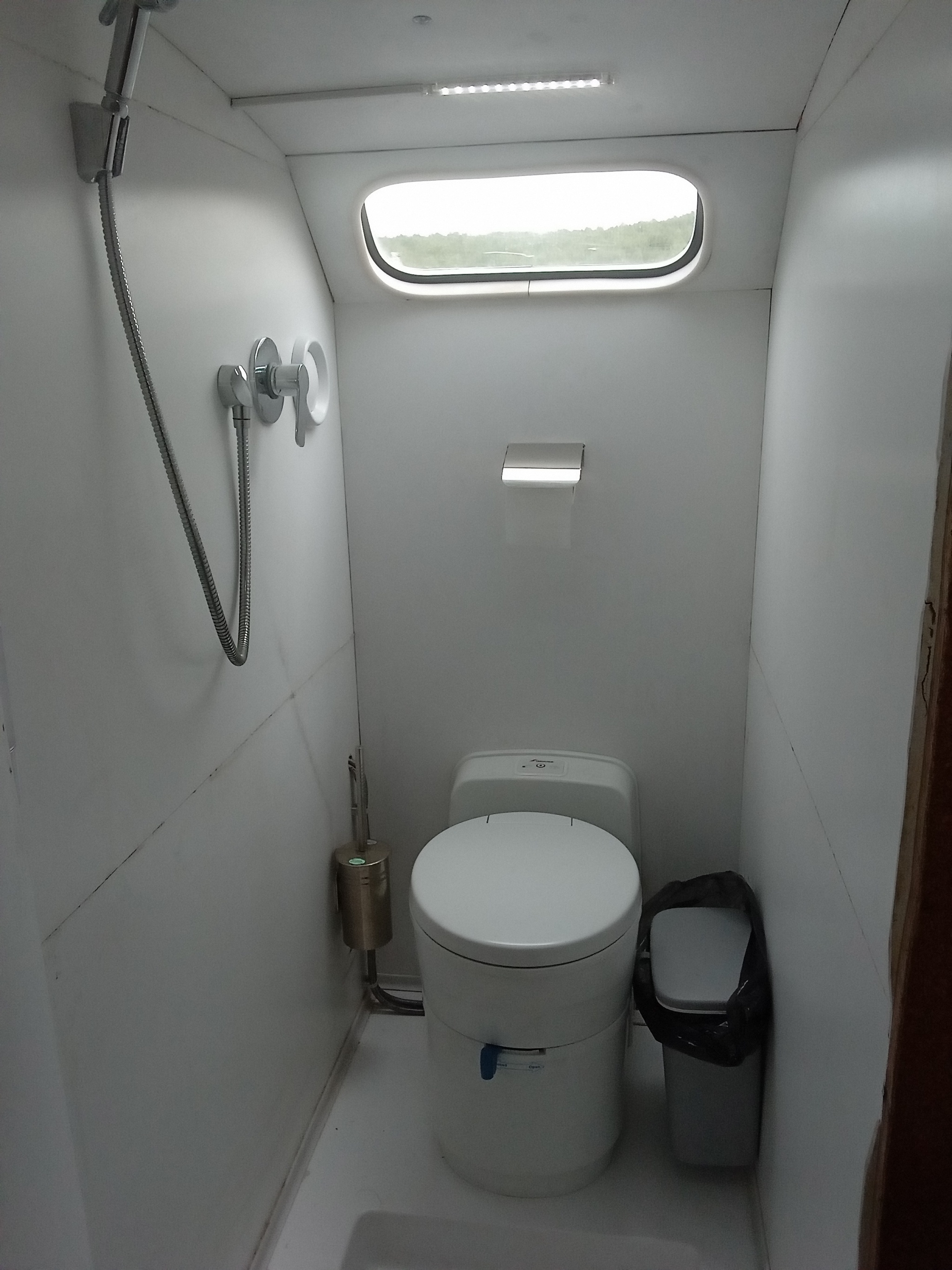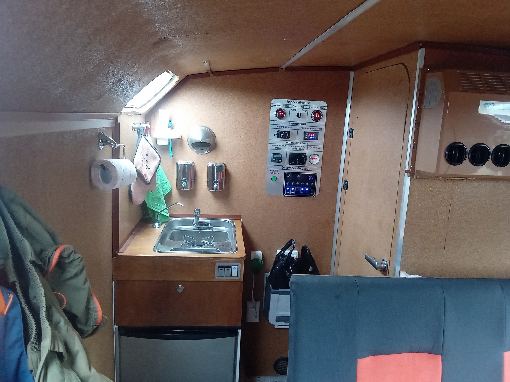 В жилом отсеке предусмотрены туалет, душ, холодильник, мойка, плита, телевизор, освещение.