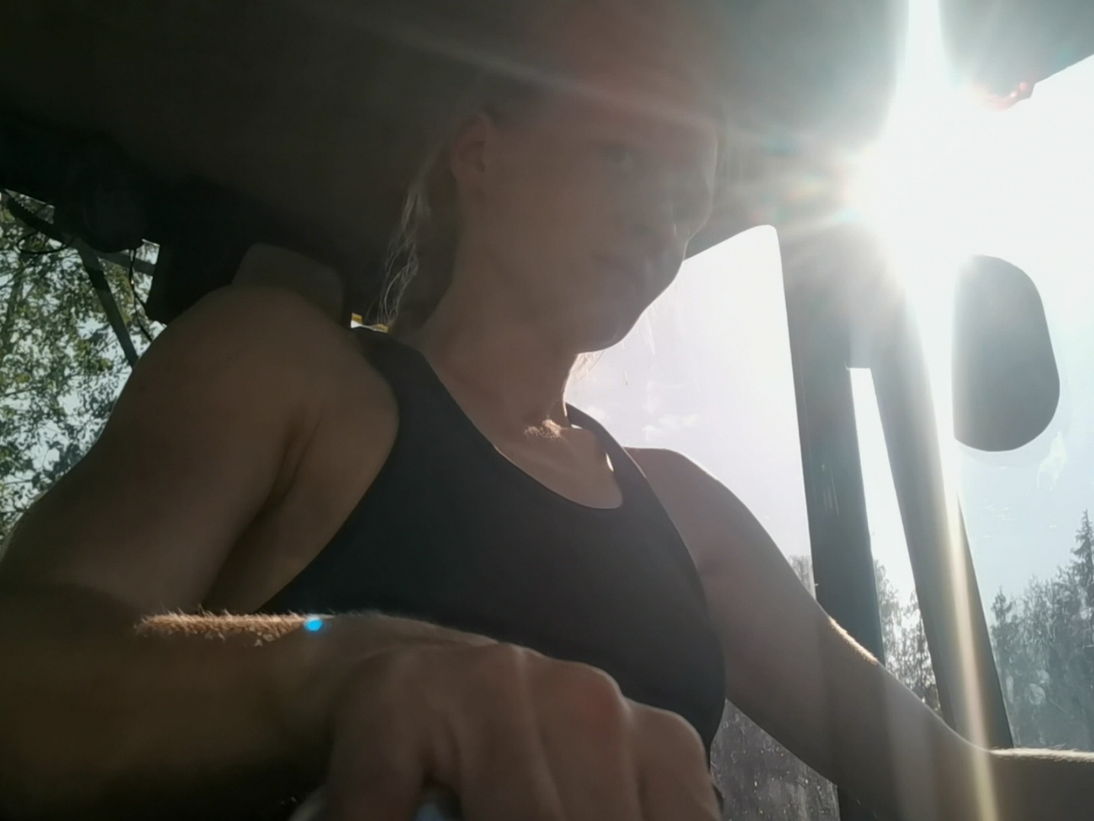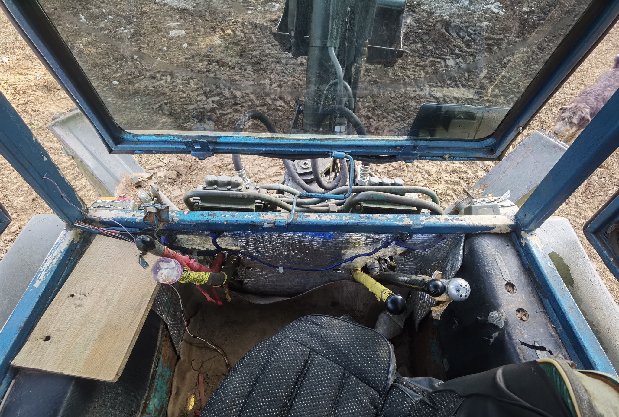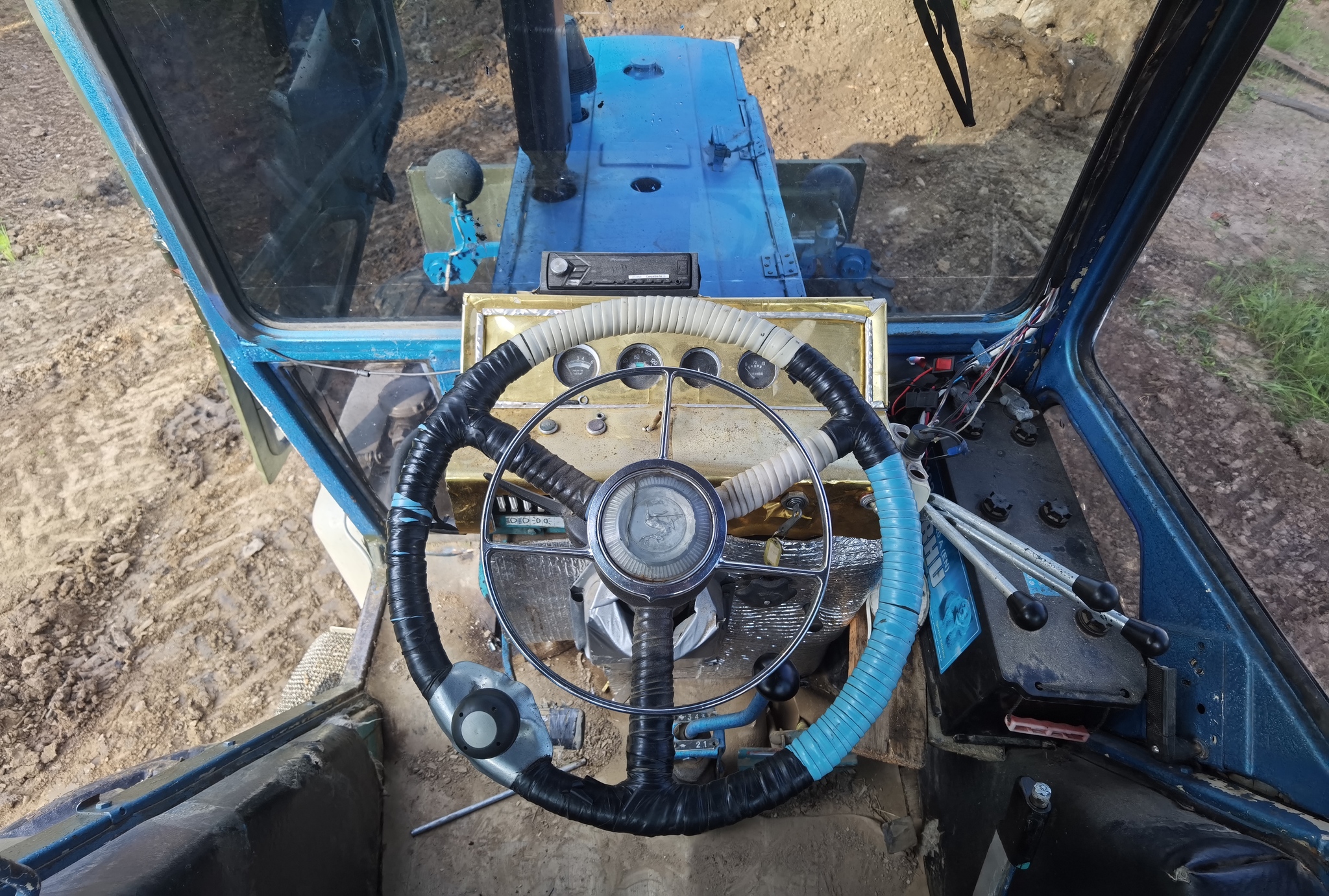 Газ ручной, на котором заботливо нацарапана рисочка холостого хода, и есть привычная педаль, которую надо немного оттянуть назад, когда нужно заглушить трактор. Так же в кабине есть иконка "спаси и сохрани", я сначала не поняла зачем, но потом как поняла, когда трактор первый раз лихо накренился при втыкании ковша в грунт.
